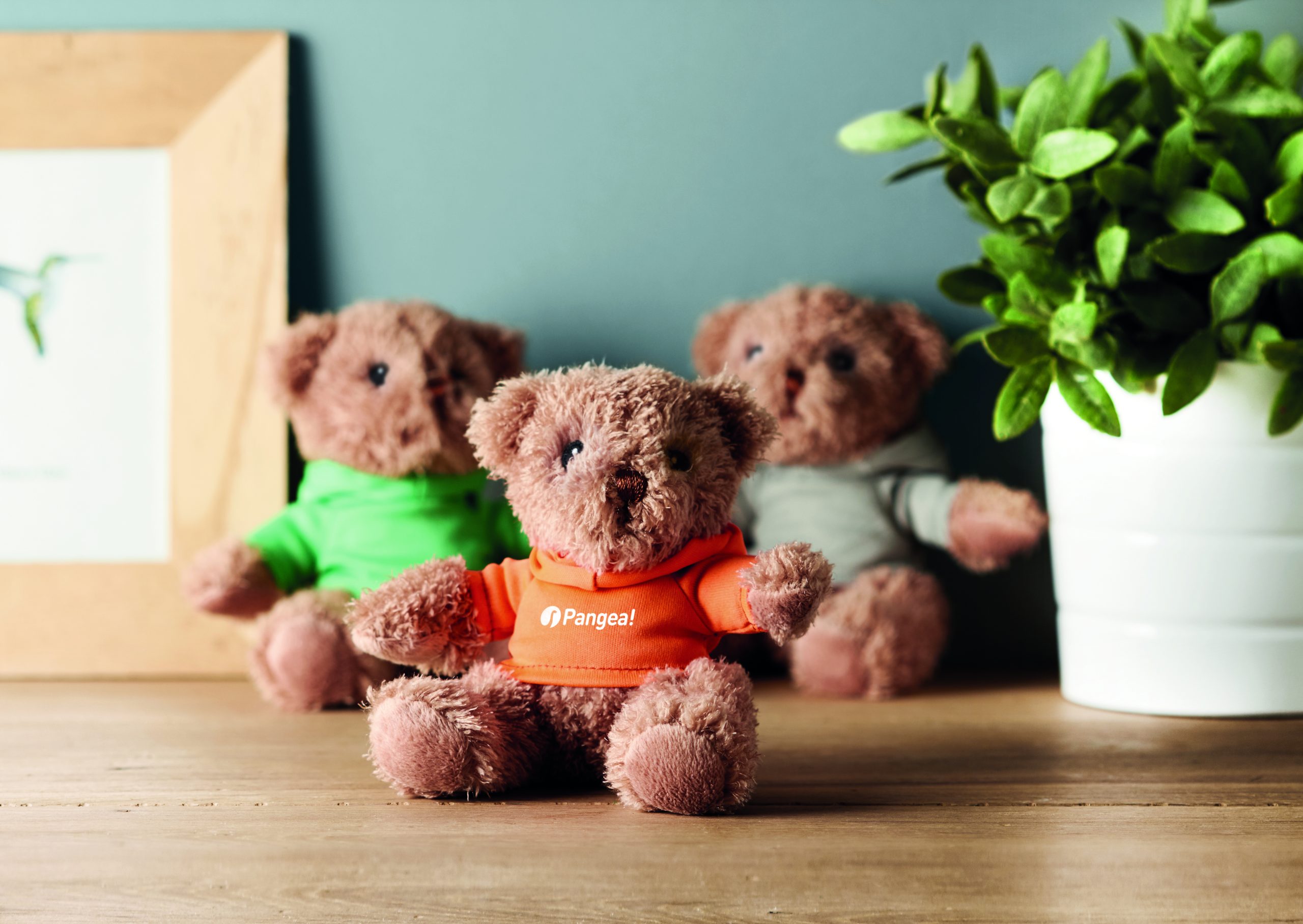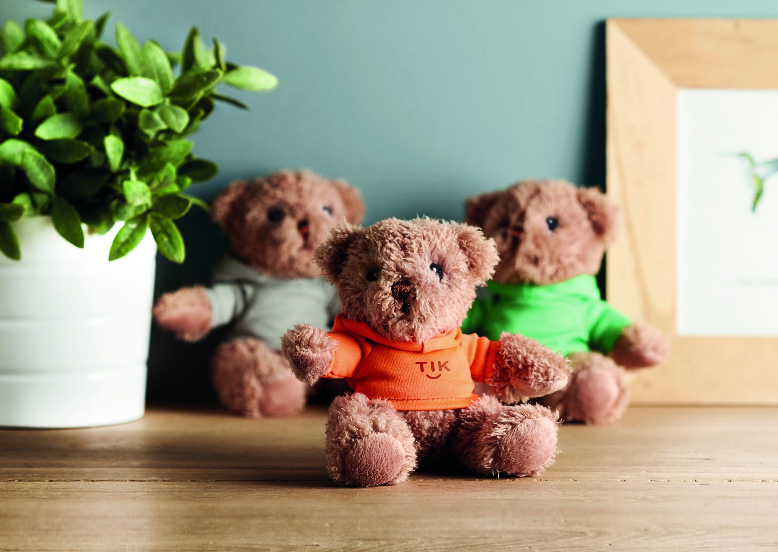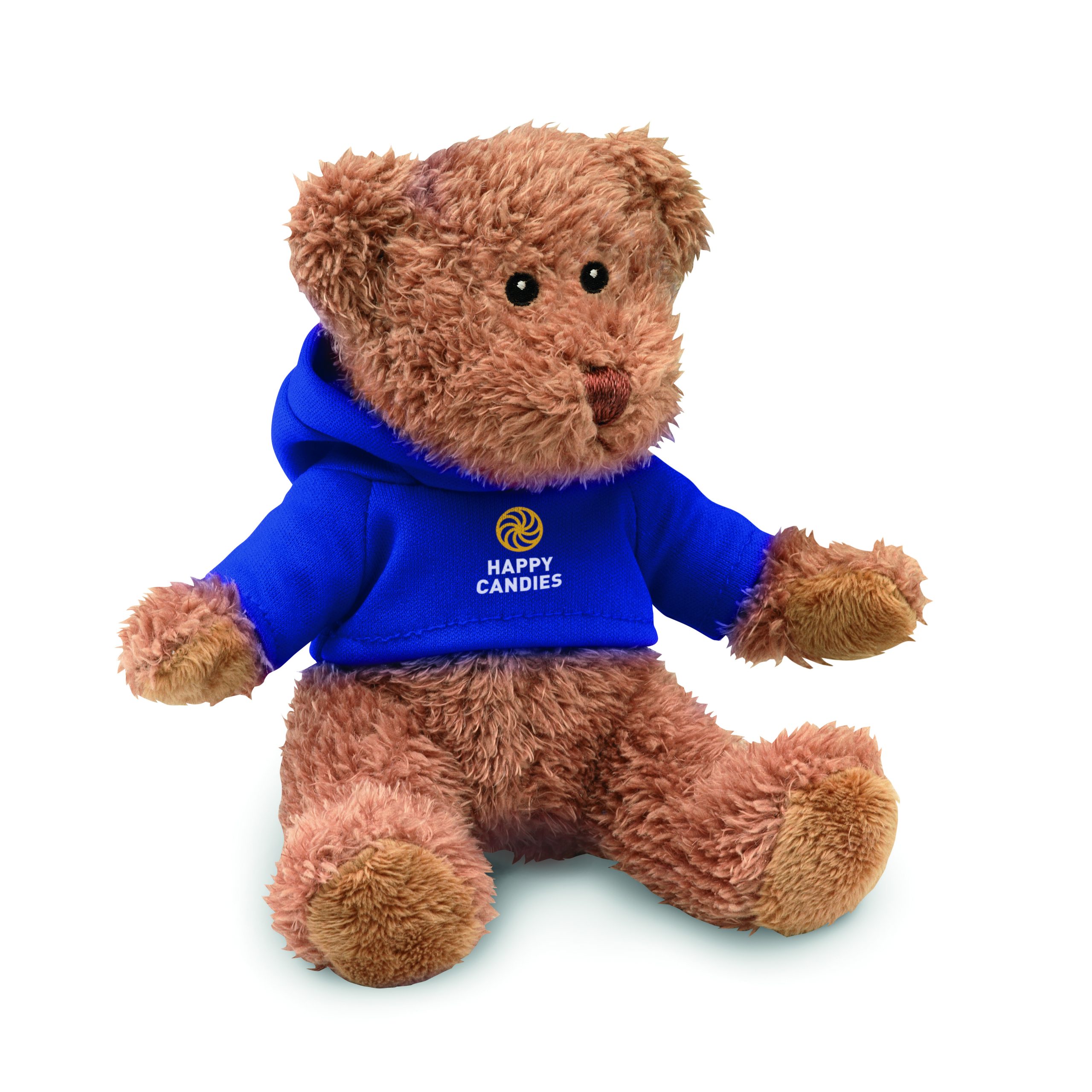 Teddy bear plush wearing a hooded sweater. Sublimation print available on white item only.