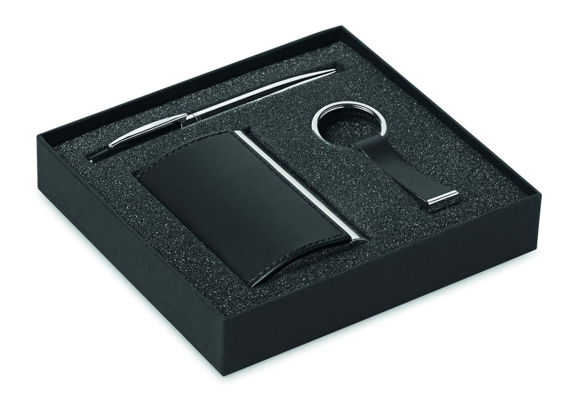 Business gift set including metal twist ball pen, zinc alloy with PU keyring and card holder. Presented in a box. Black ink.