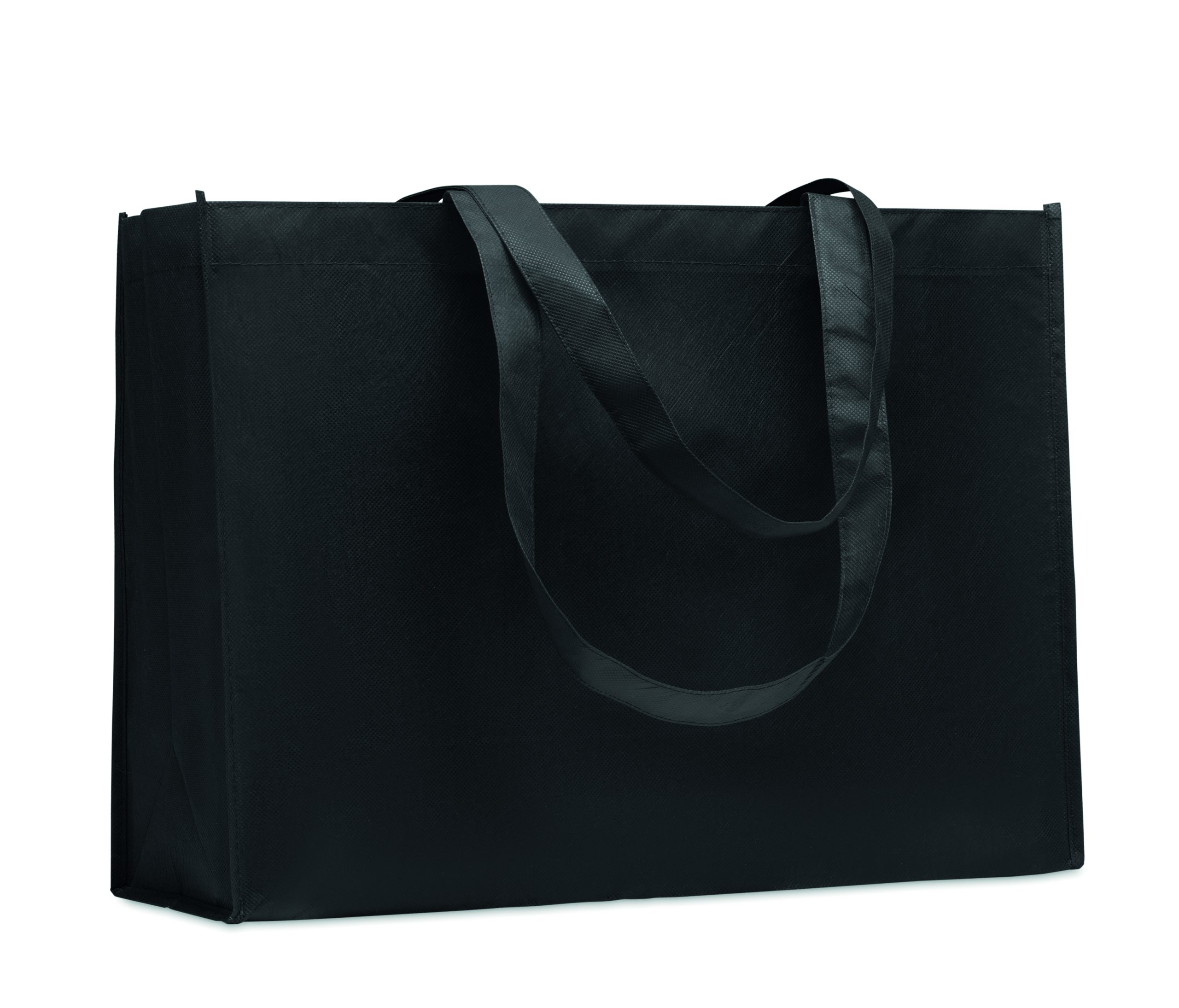 Shopping or beach bag in RPET non-woven with gussets and long handles. 80 gr/m².