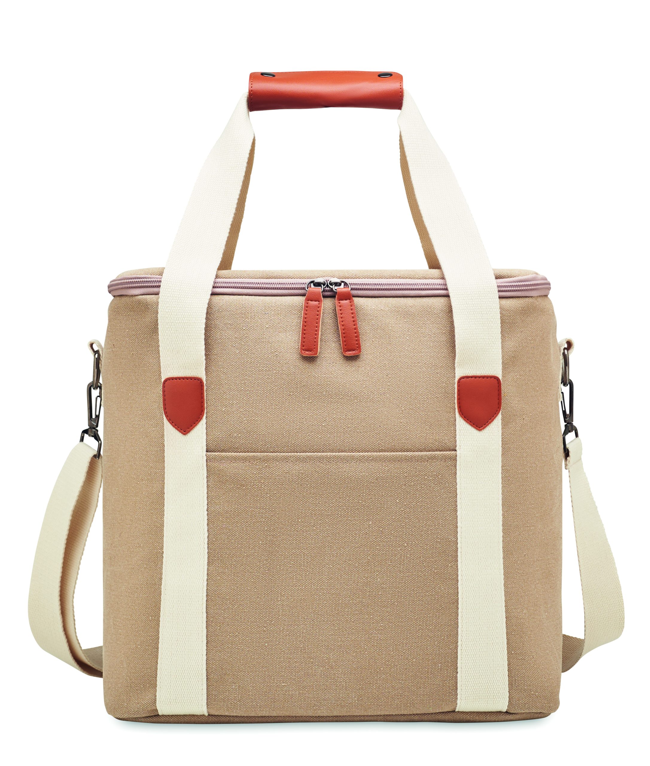 Large cooler bag in washed canvas with cotton strap. 450 gr/m². Insulation: 15C PEVA with 6mm PE foam.