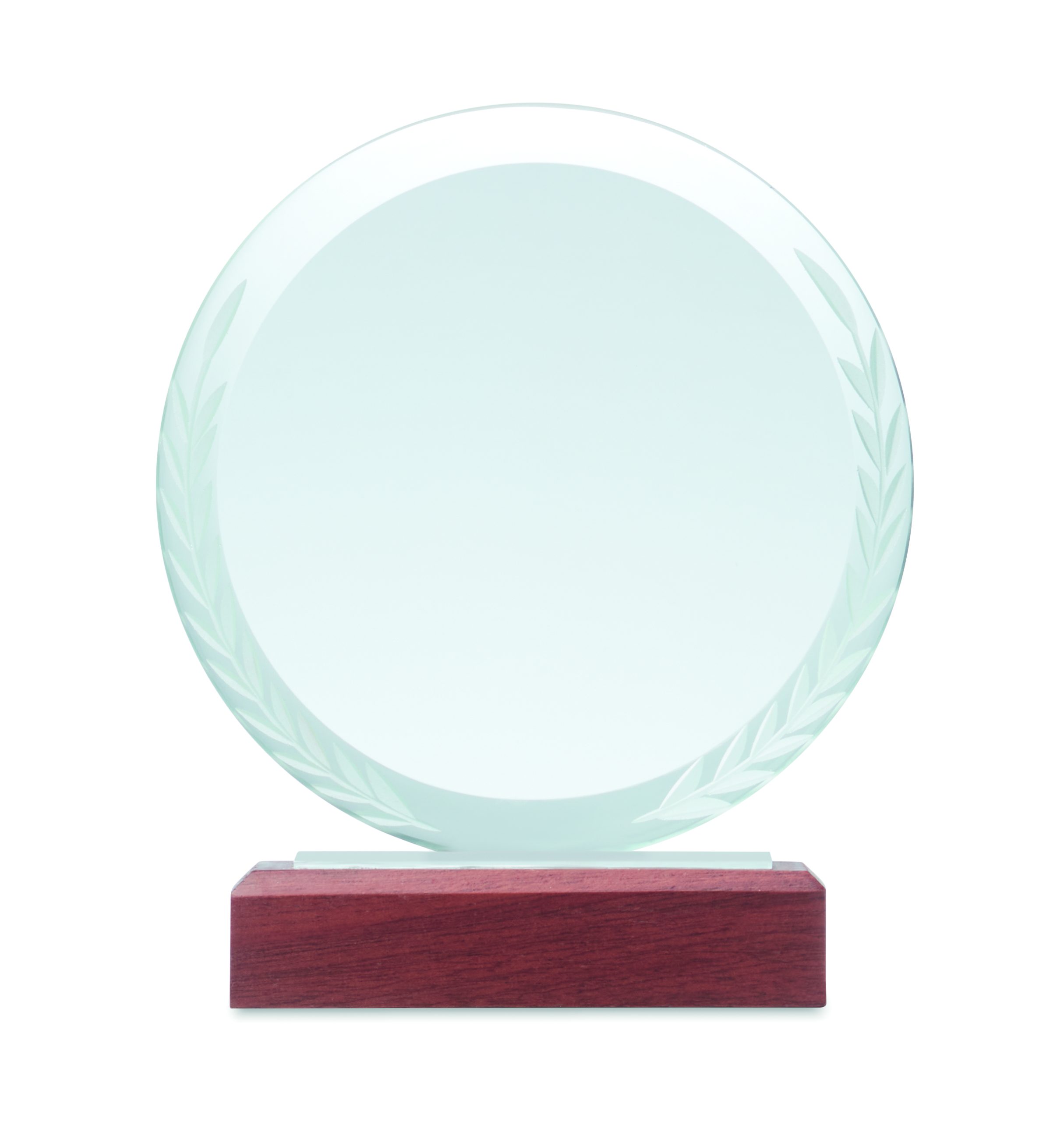 Round crystal award or memorial plaque on a beech wooden base in a gift box.