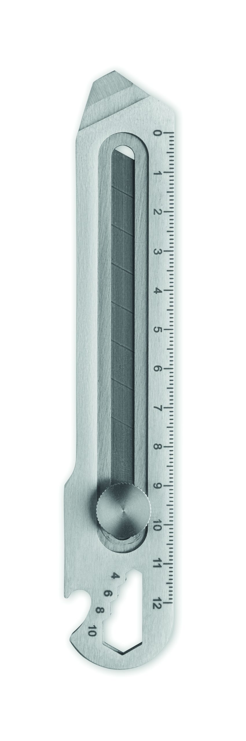 Stainless steel retractable knife with 8 carbon steel blades, bottle opener, wrench and ruler.