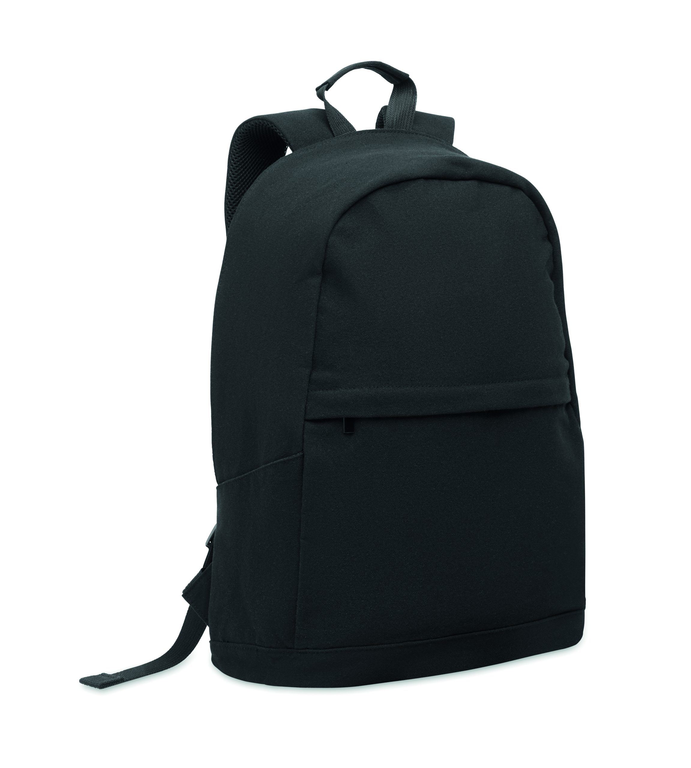 15 inch laptop backpack in recycled pre-consumer cotton and recycled polyester (70%/30%). It has front zippered pocket, zippered pocket on the back side. Soft padded back and shoulder straps. Trolley holder on reverse side.