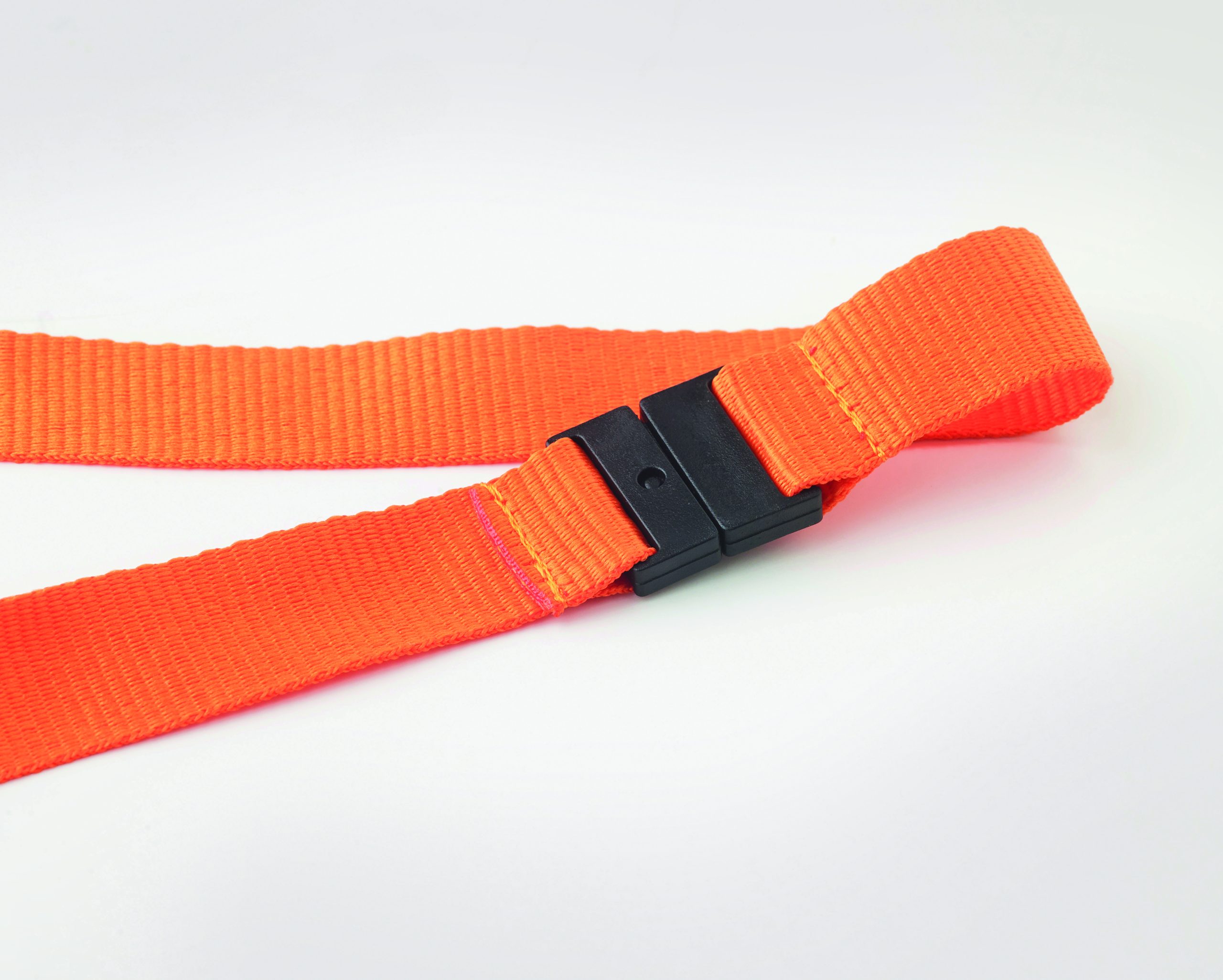 Lanyard with metal hook, detachable buckle and safety breakaway. 20 mm wide.