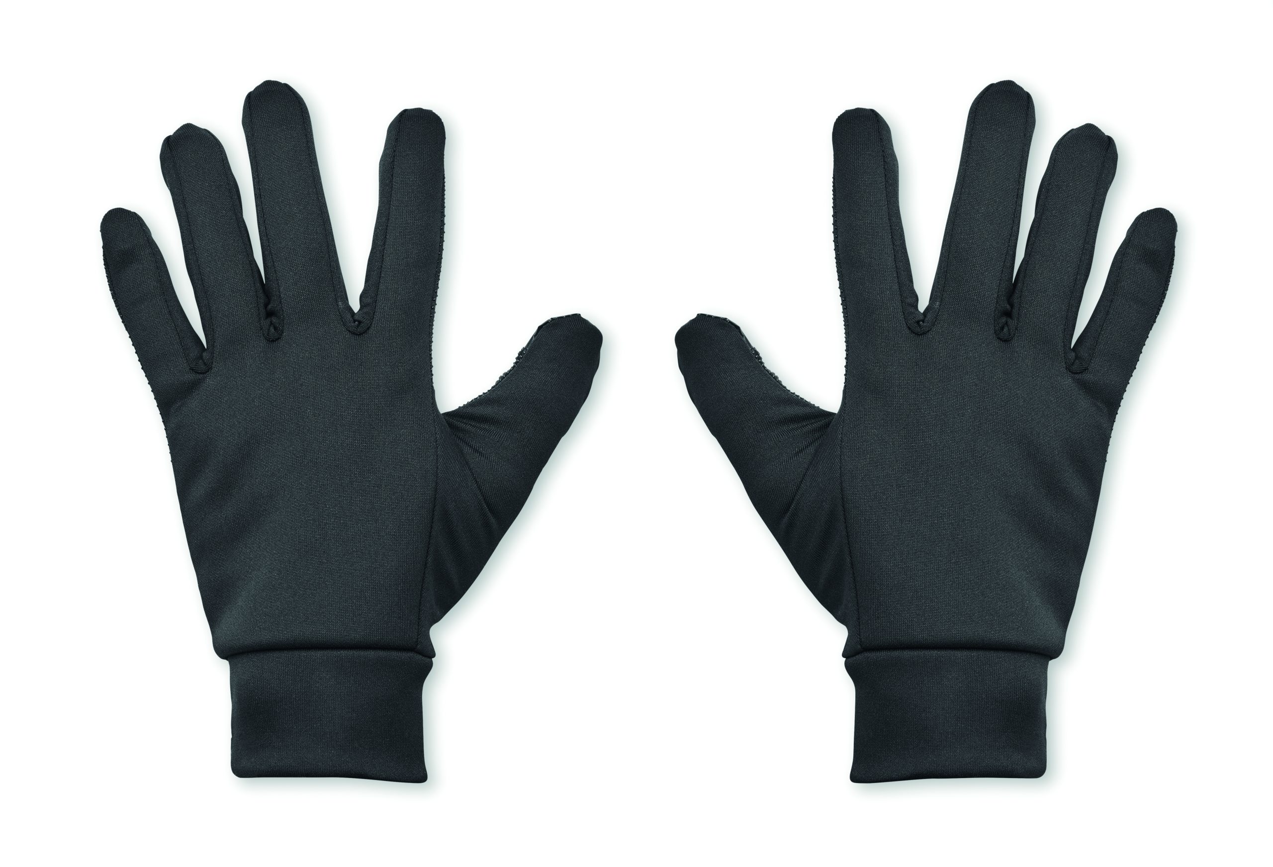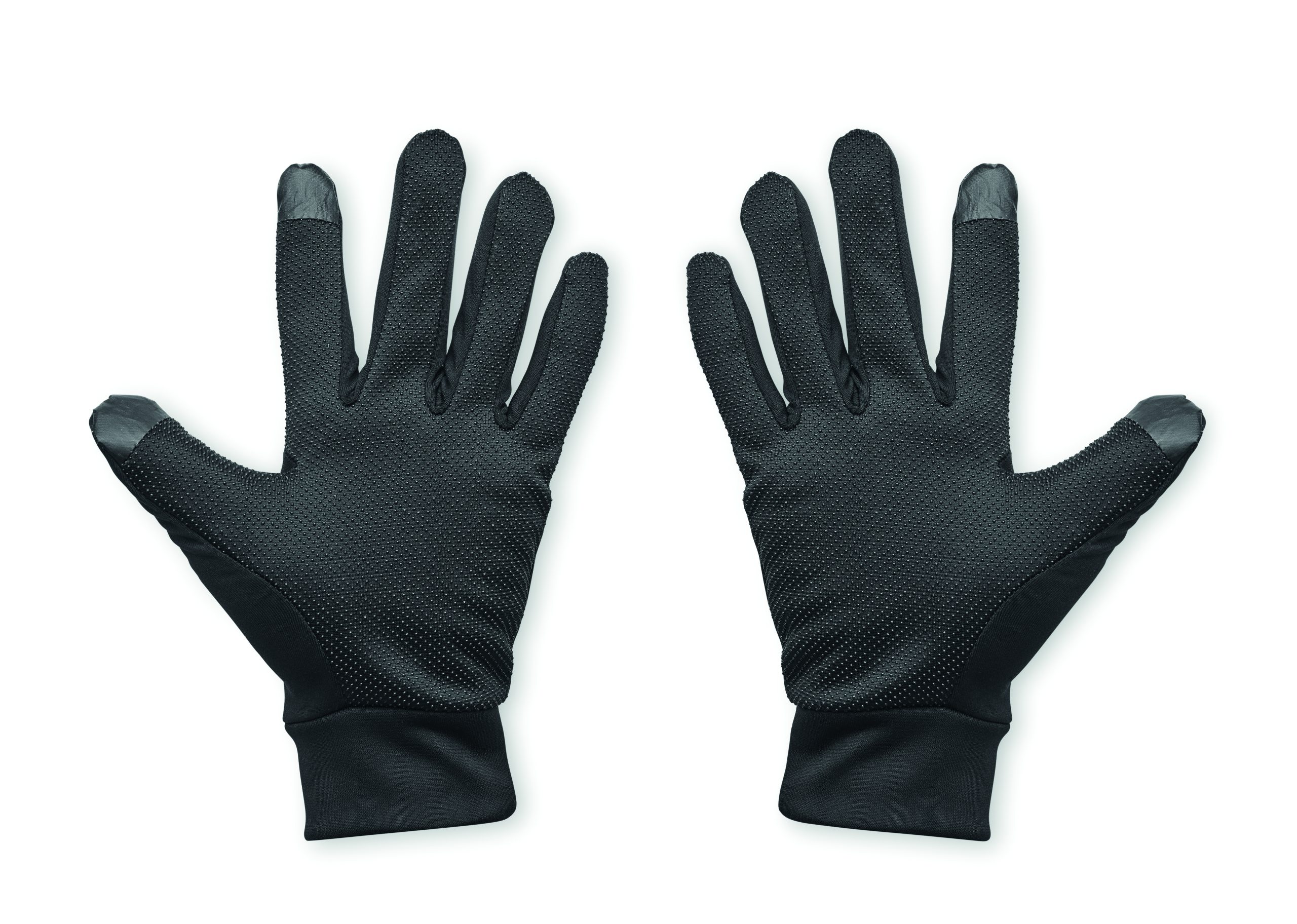 Tactile sport gloves for smartphone in polyester. Two fingers with touch function with anti-slip dots on palm and finger in PVC.