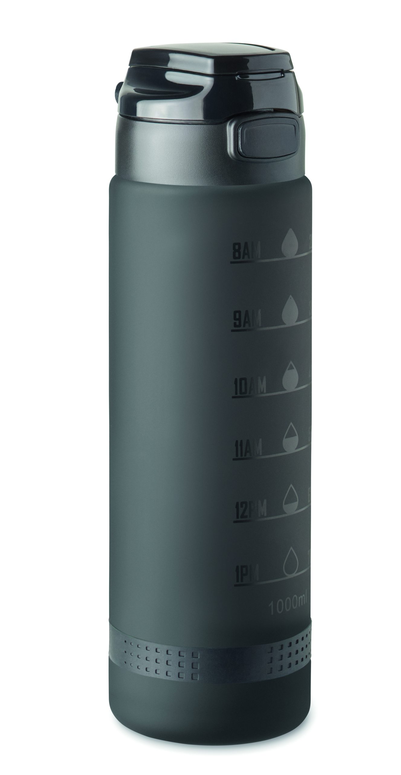 Sports water bottle in RPET, motivational time markings, one hand opening flip top lid, safety lock and carrying strap. Capacity: 1L.