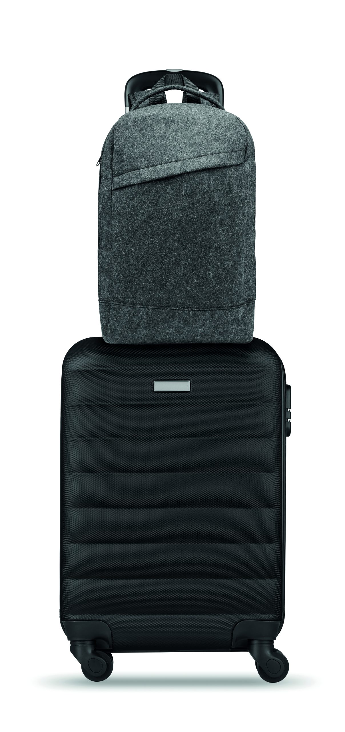 13 inch laptop backpack in RPET felt with padded shoulder and strap with a main internal compartment. Zippered compartment inside. Trolley holder on reverse side.