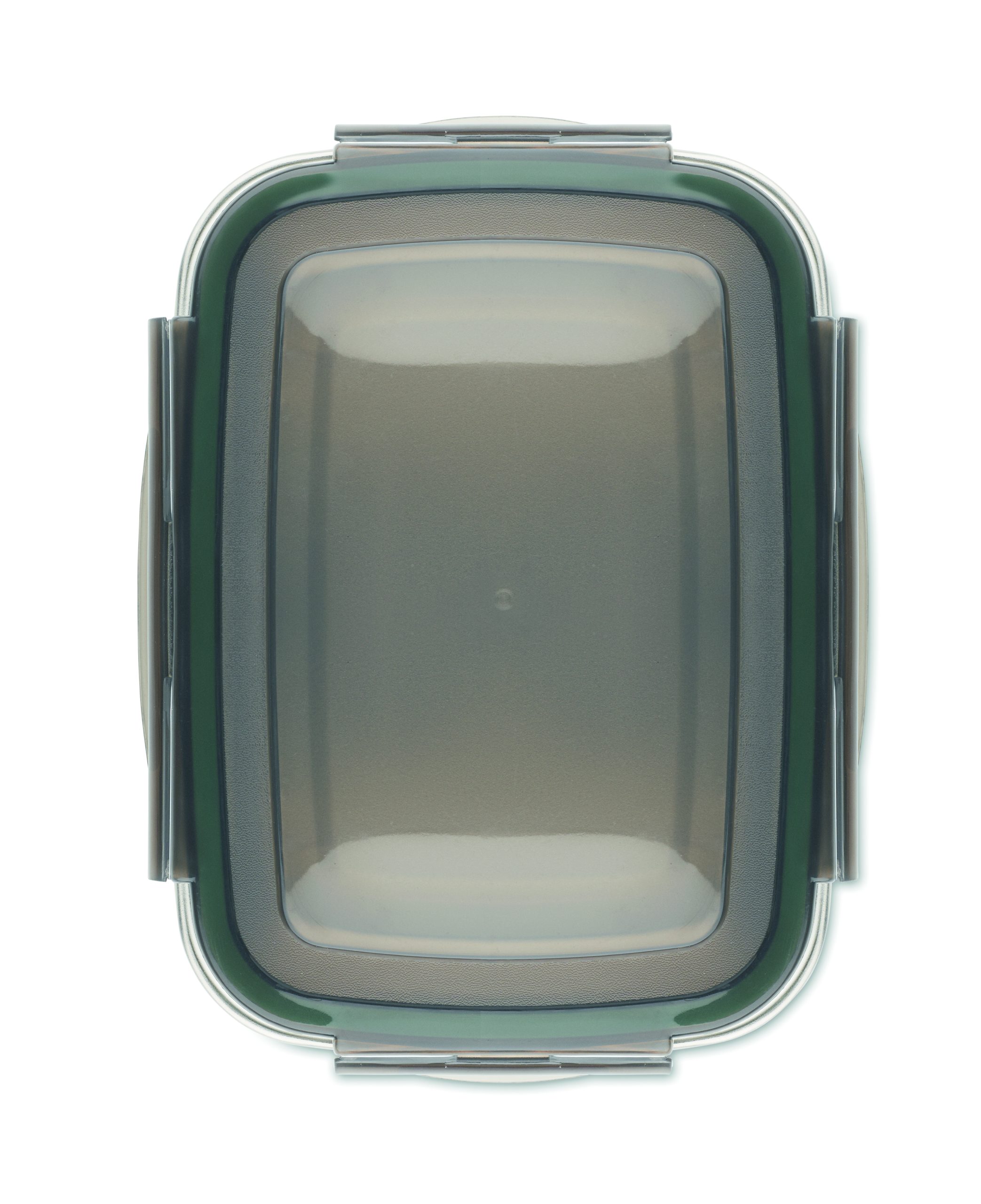 Recycled stainless steel lunch box with PP lid and 4 side clasp closure. Capacity: 850 ml.