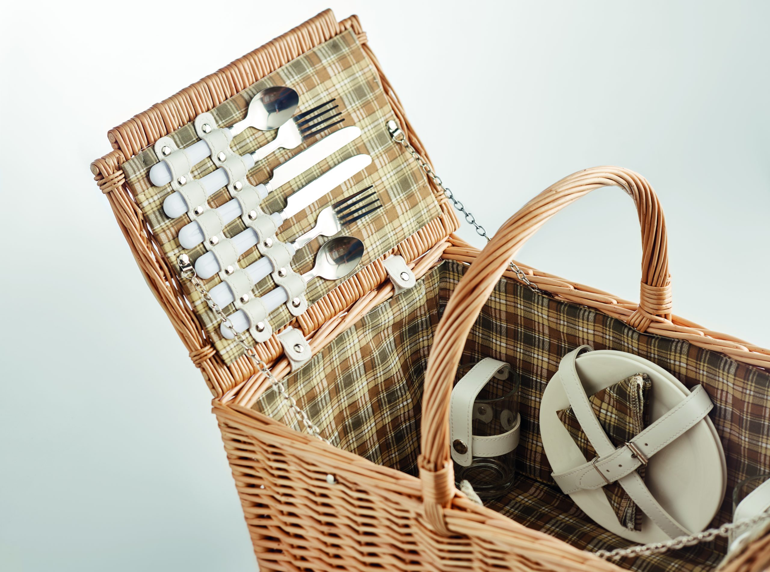 Wicker 4 person picnic basket set with 4 stainless steel spoons, forks and knives, 4 ceramic plates, 4 glasses, 1 bottle openner and 4 polycotton napkins.