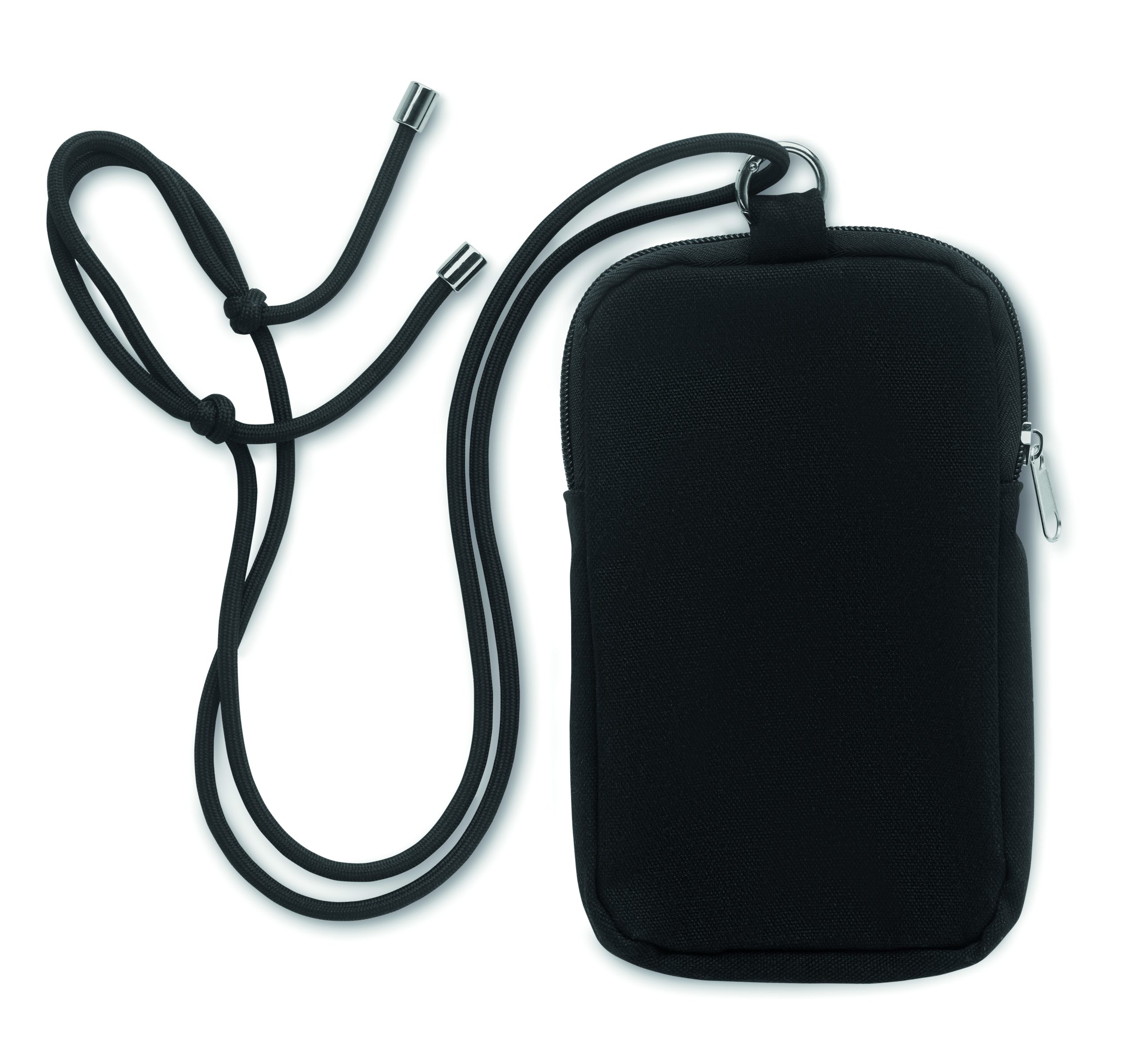 Cross body smartphone bag in recycled cotton with RPET polyester adjustable lanyard with open pocket on front side. 280 gr/m².