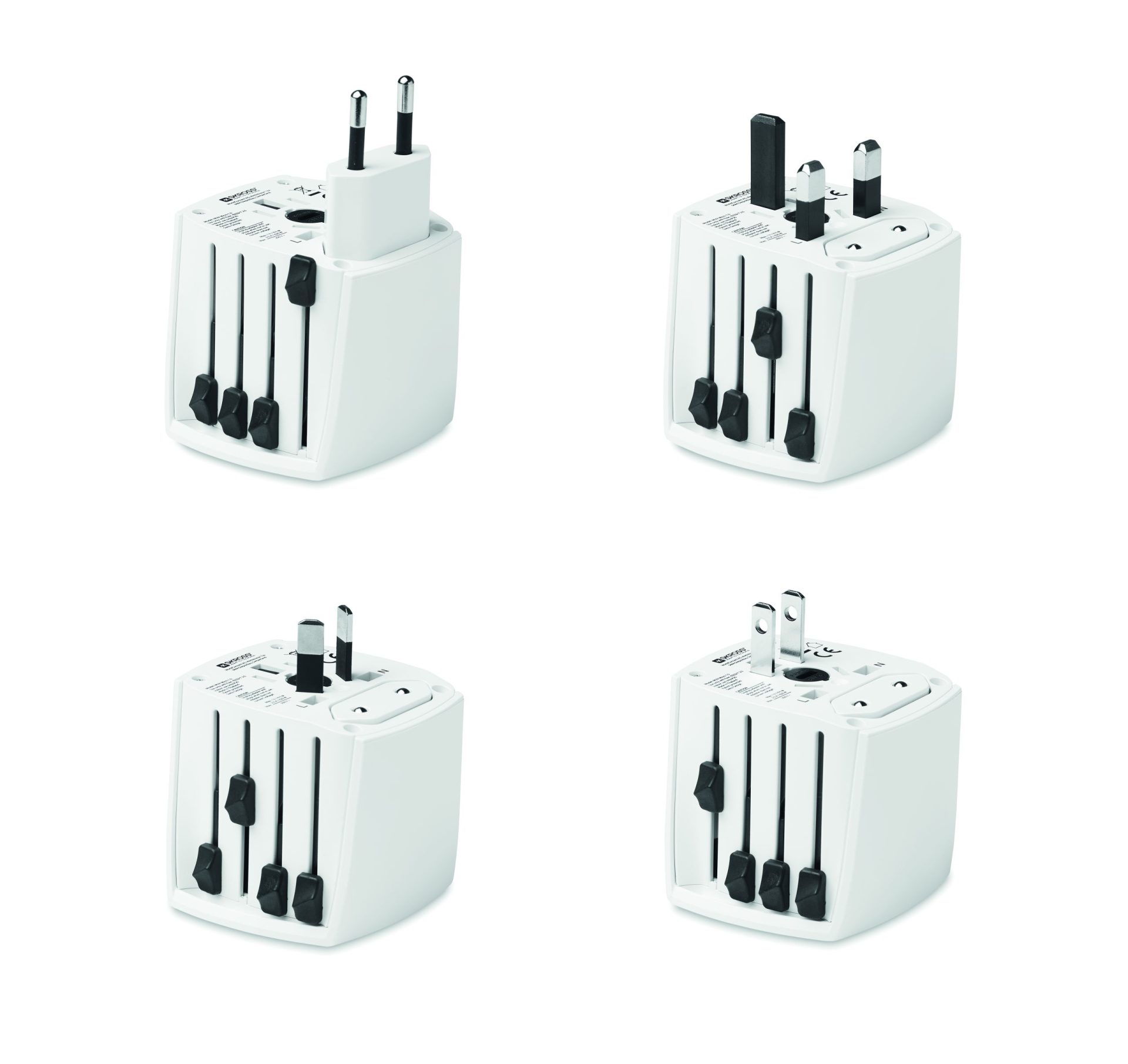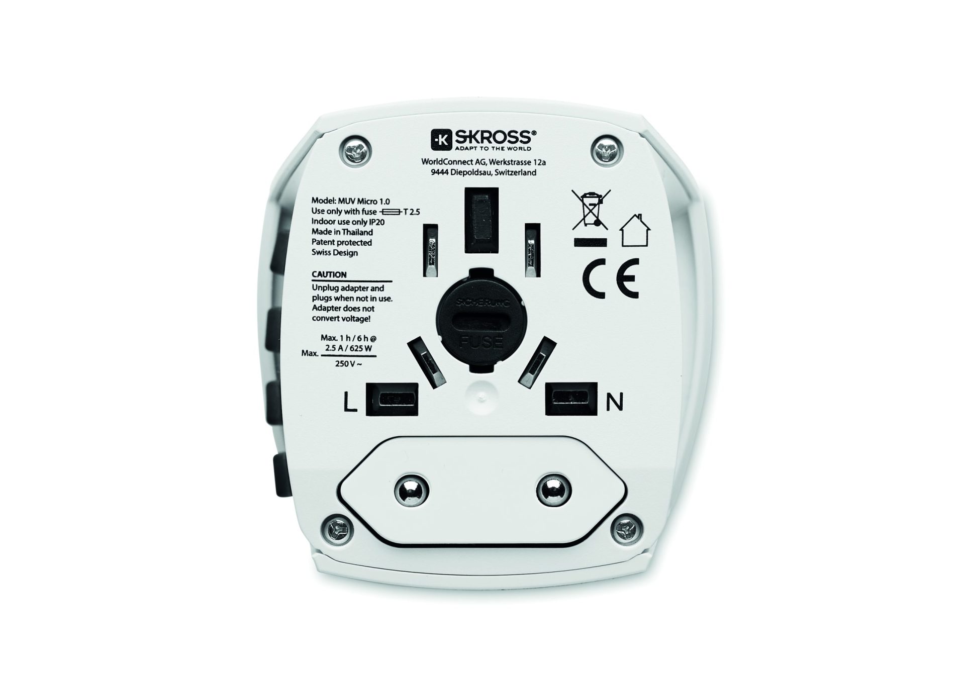 Universal SKROSS® travel adapter. Receptacles for Europe, USA/Japan, Australia/China. 2-pole, unearthed. Fulfils all international security-relevant standards and norms. Even child safe.