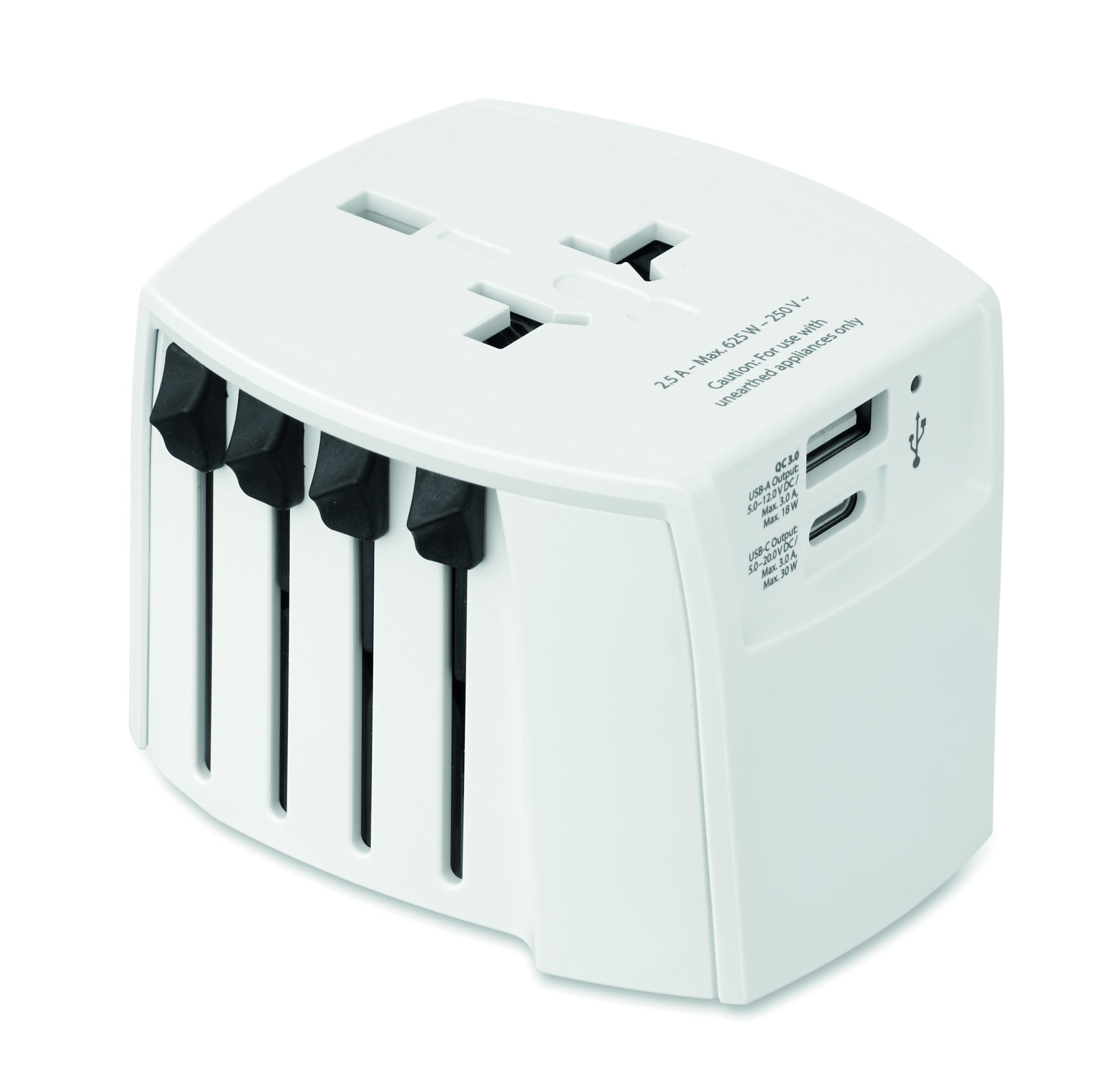 SKROSS® MUV USB — universal 2-pole travel adapter with USB-A and Type-C ports. Delivers 30W via Type-C and 18W via USB-A for fast, safe charging worldwide. Compact, powerful, and travel-ready.