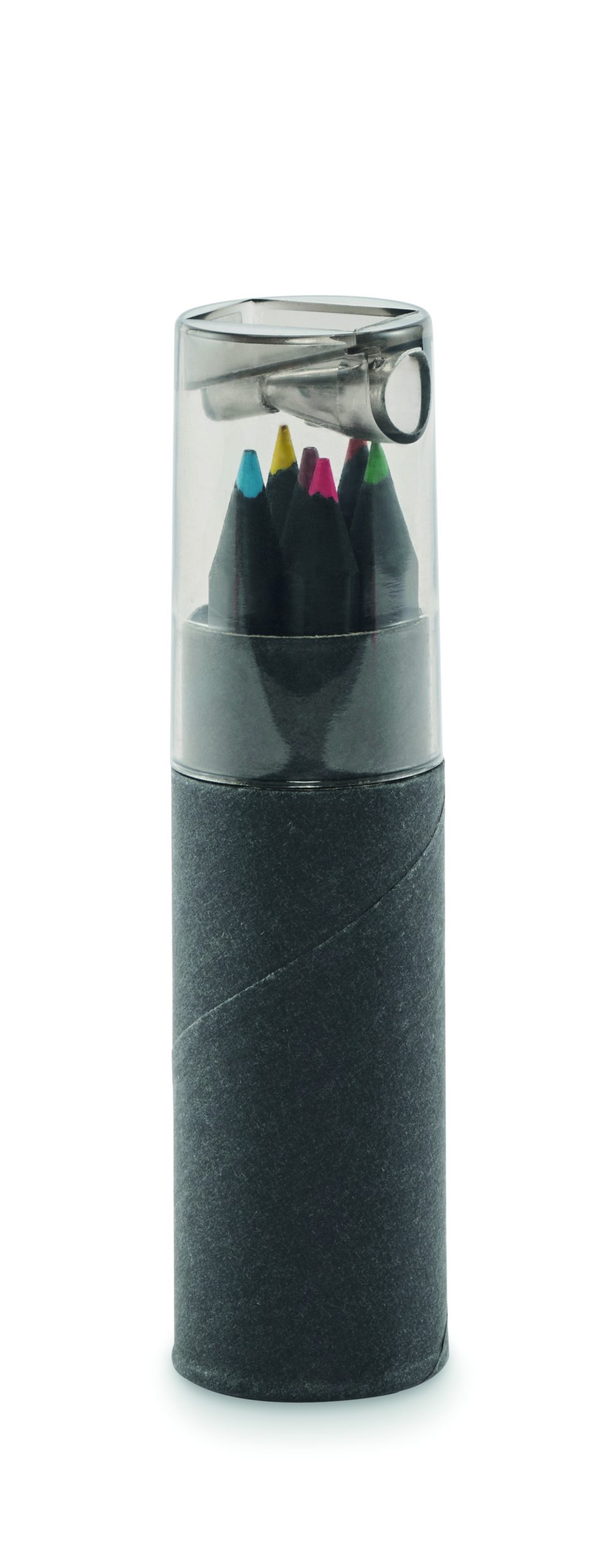 Black coloured paper tube box contains 6 colouring pencils and a pencil sharpener in the lid of the box.