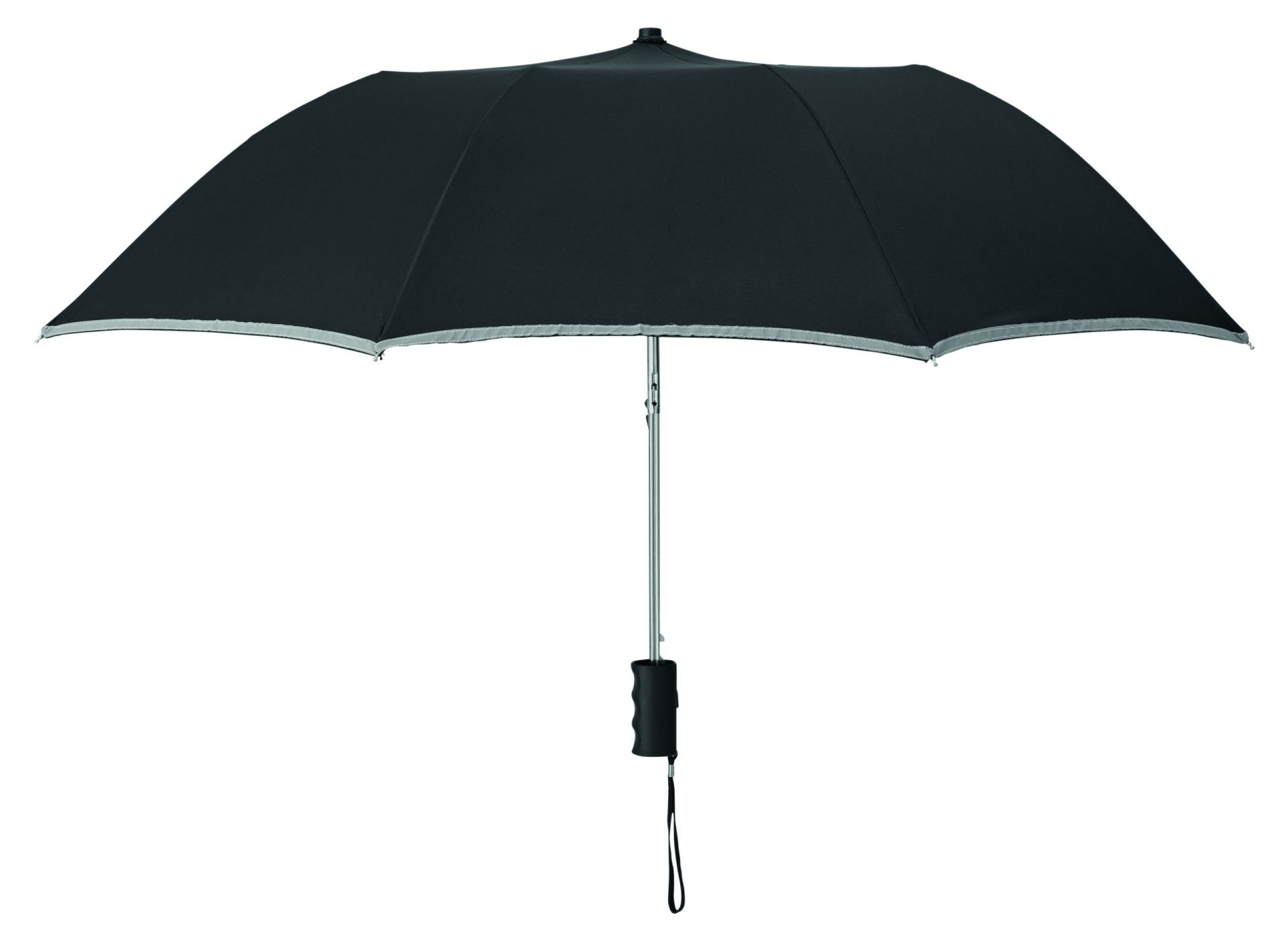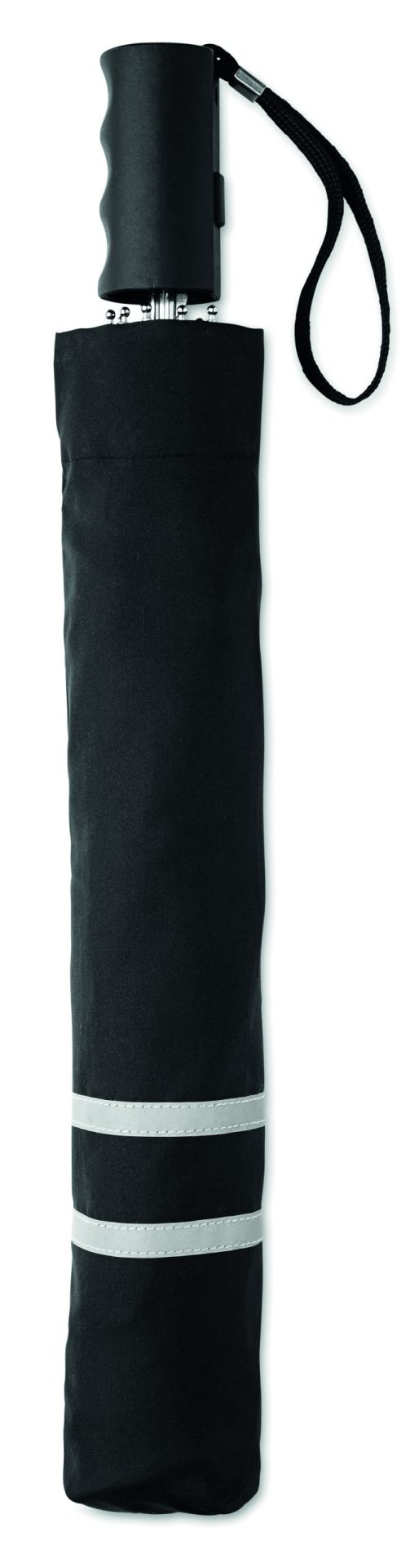 21 inch 2 fold auto open umbrella in 190T pongee with zincify plating steel shaft, ribs and tips. Panels with reflective trim. Black plastic handle with wrist strap. Includes matching pouch with reflective trims. Manual closure.