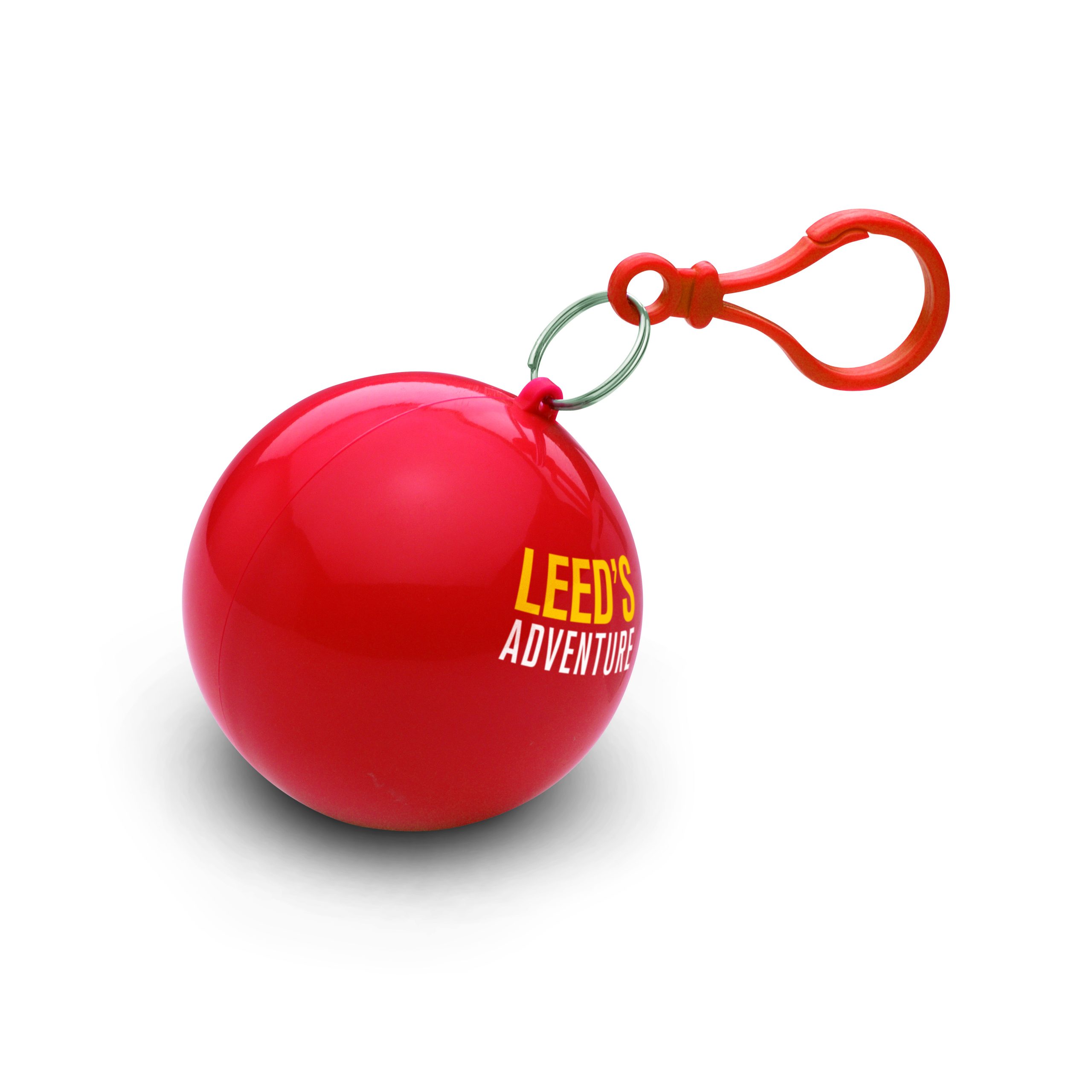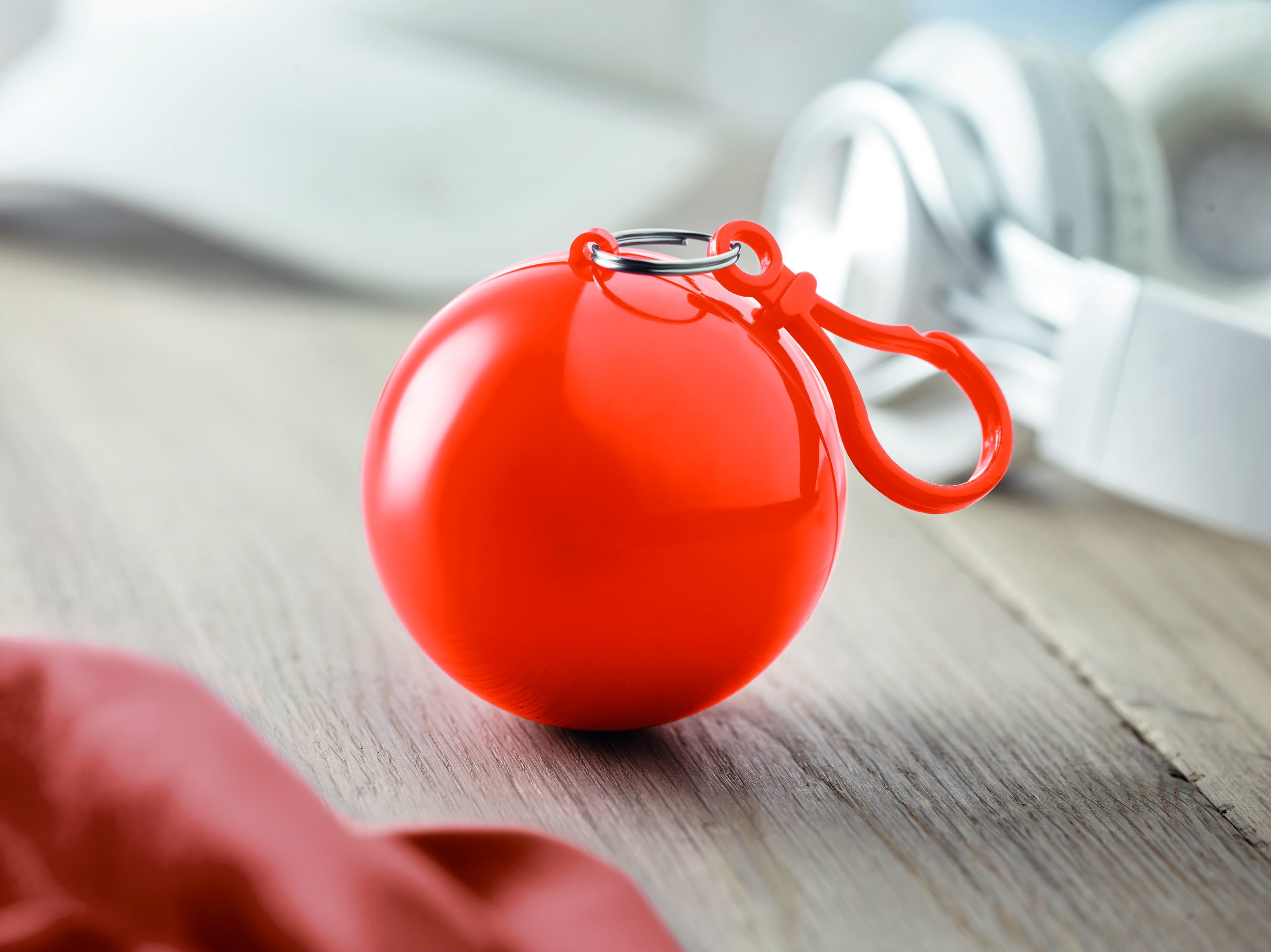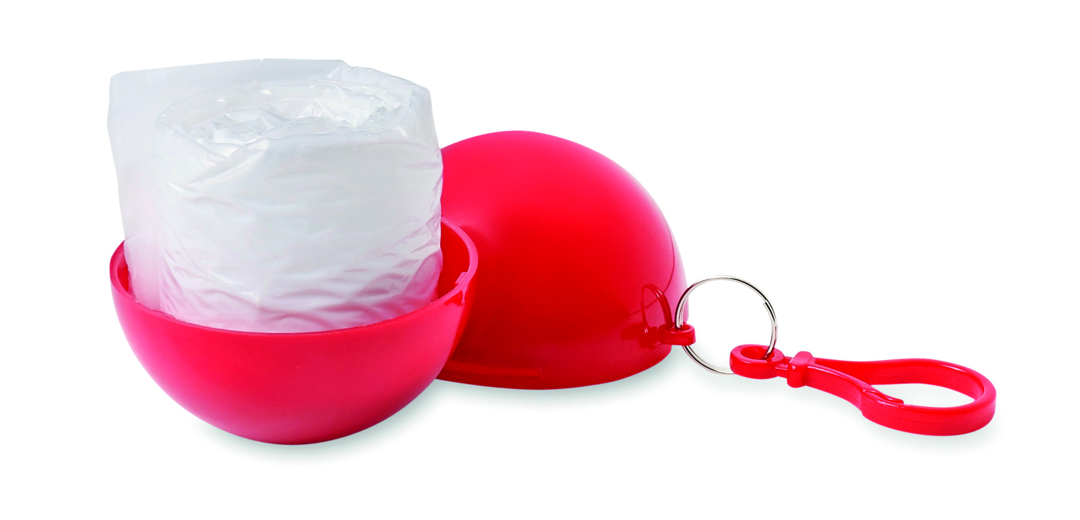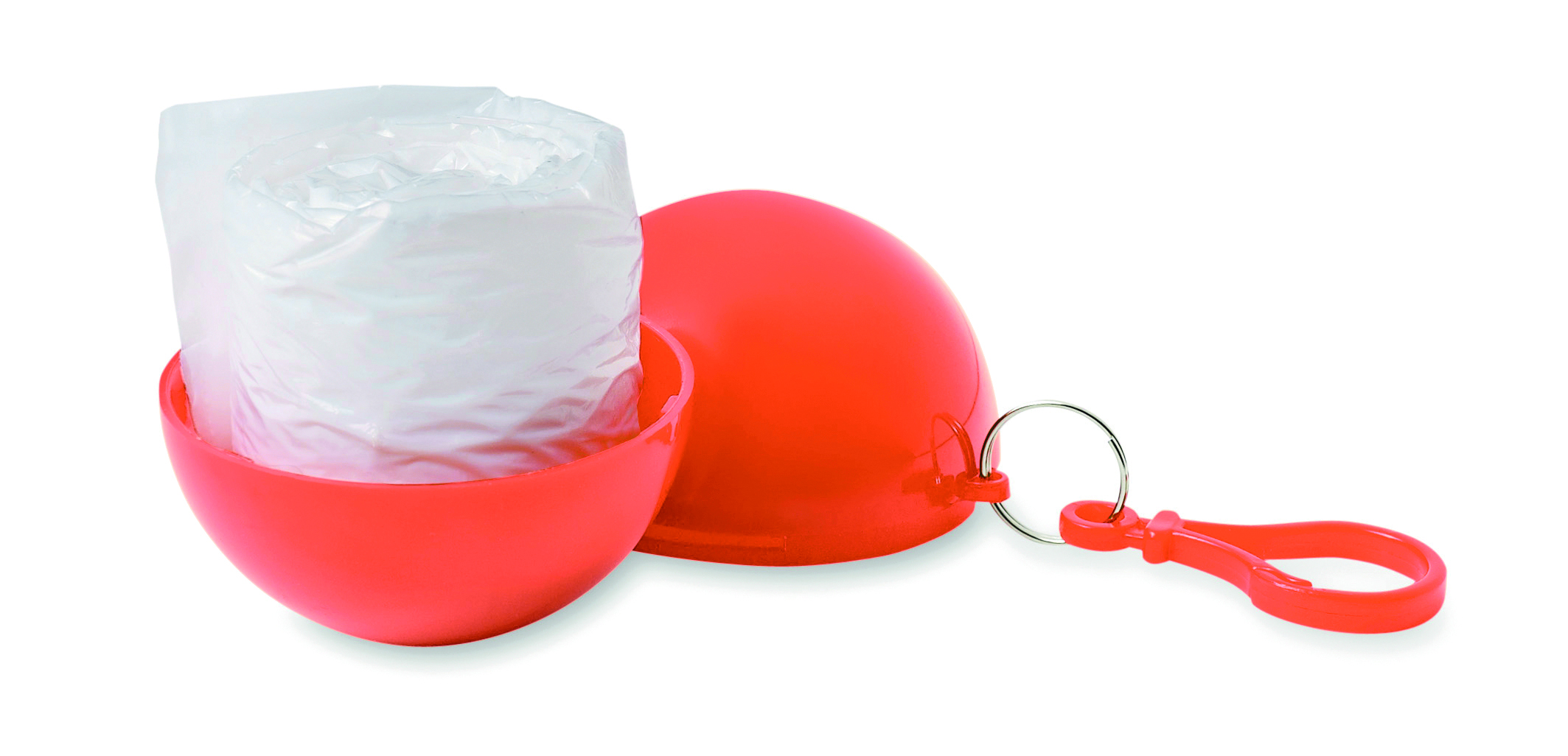 Transparent PE poncho wrapped in an AS ball shell with carabiner hook to hang on a belt or a bag.
