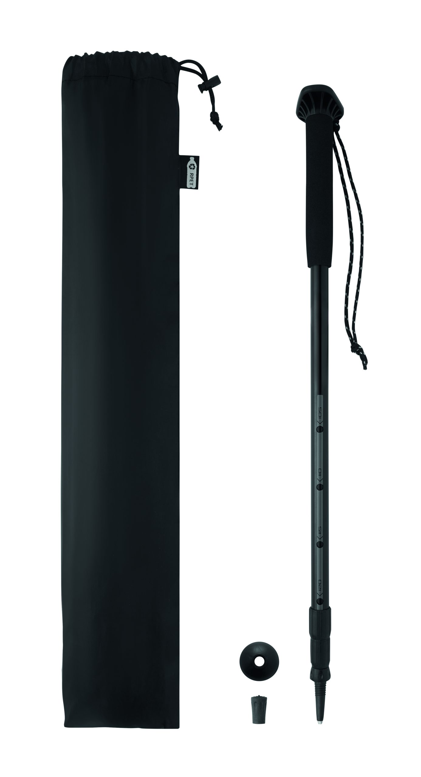 Telescopic walking pole with EVA handle, wrist strap, rubber tip, and mud basket. Adjustable from 105 to 120 cm. Packed in RPET drawstring pouch. Lightweight and durable design.