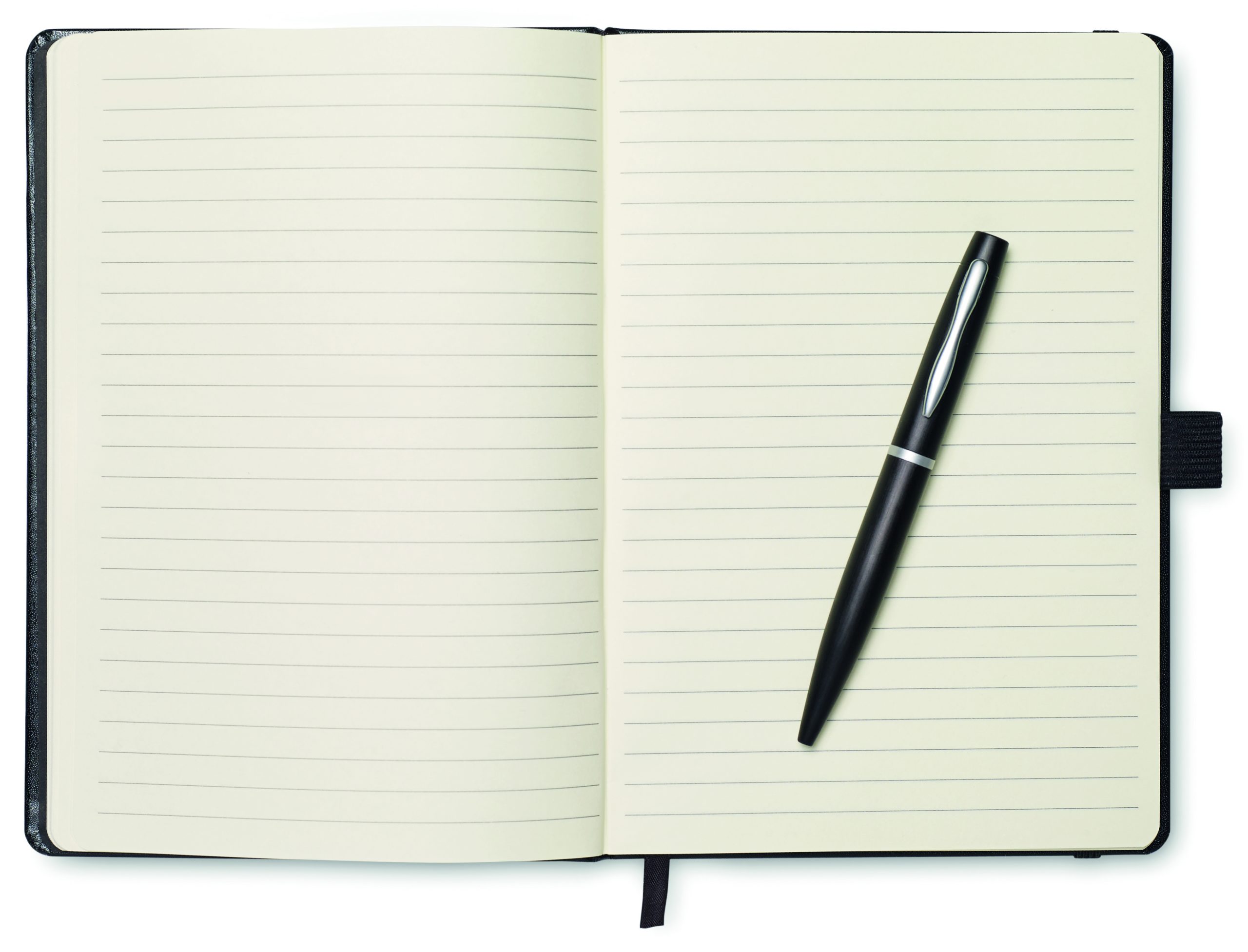 A5 notebook with pen. Hard PU cover. Casebound. 144 lined pages (72 sheets). Matching elastic closure strap, ribbon bookmark and pen holder. Matching metal push button ball pen. Blue ink. FSC MIX CREDIT | P7.1 | FSC-C213206