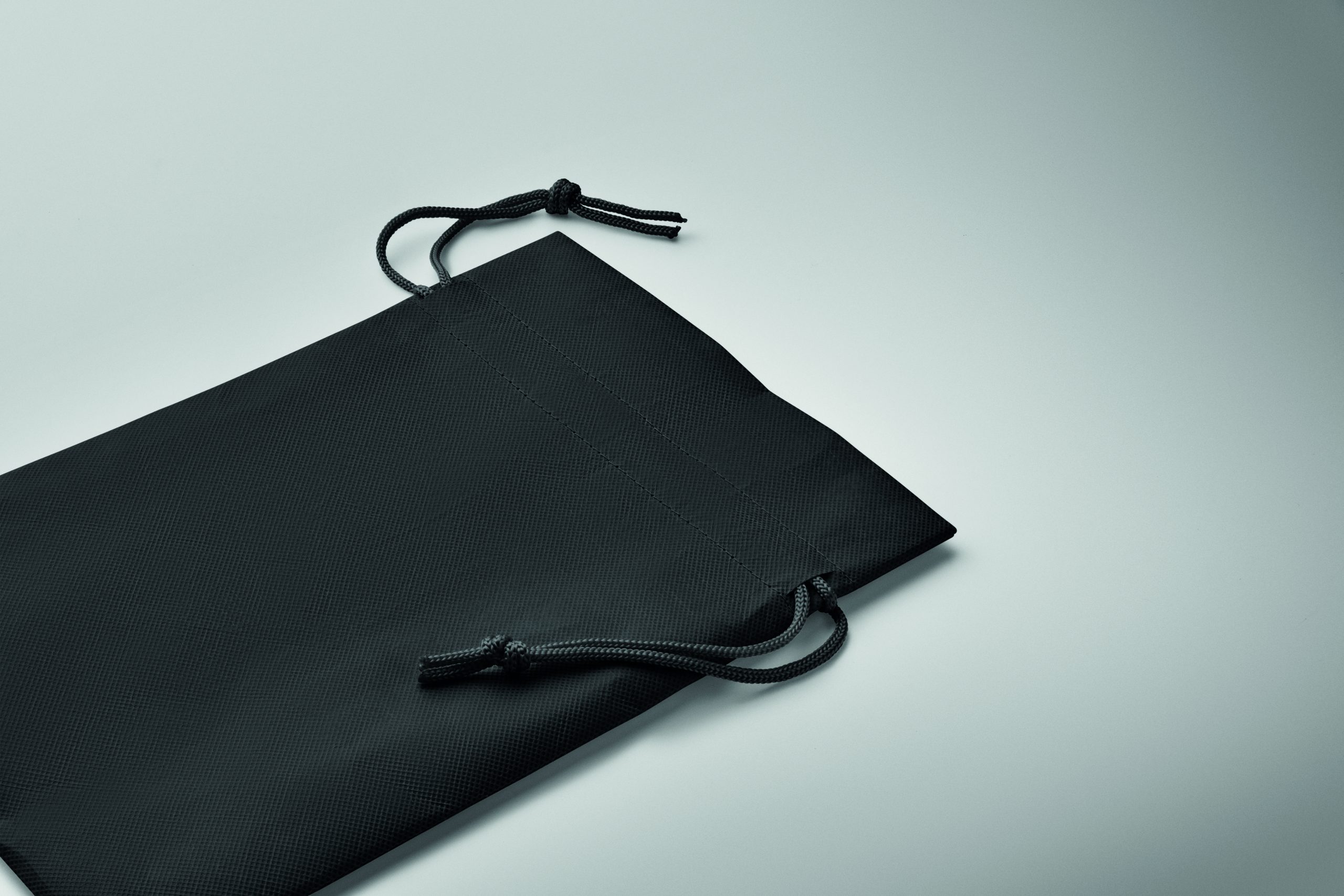 Small gift draw cord bag in RPET non-woven 80 gr/m². Size approx. 20×30 cm.