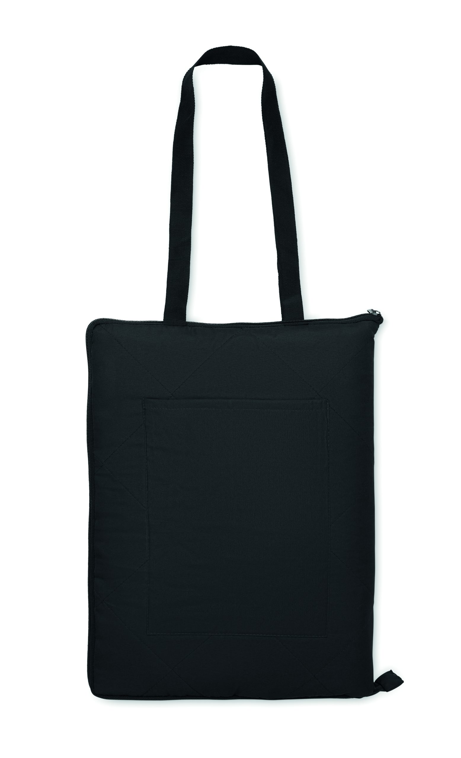 Foldable quilted picnic blanket with plastic coated PEVA on the reverse side. Folds into a convenient carry tote bag and has an adjustable shoulder strap. It includes a large front side pocket.