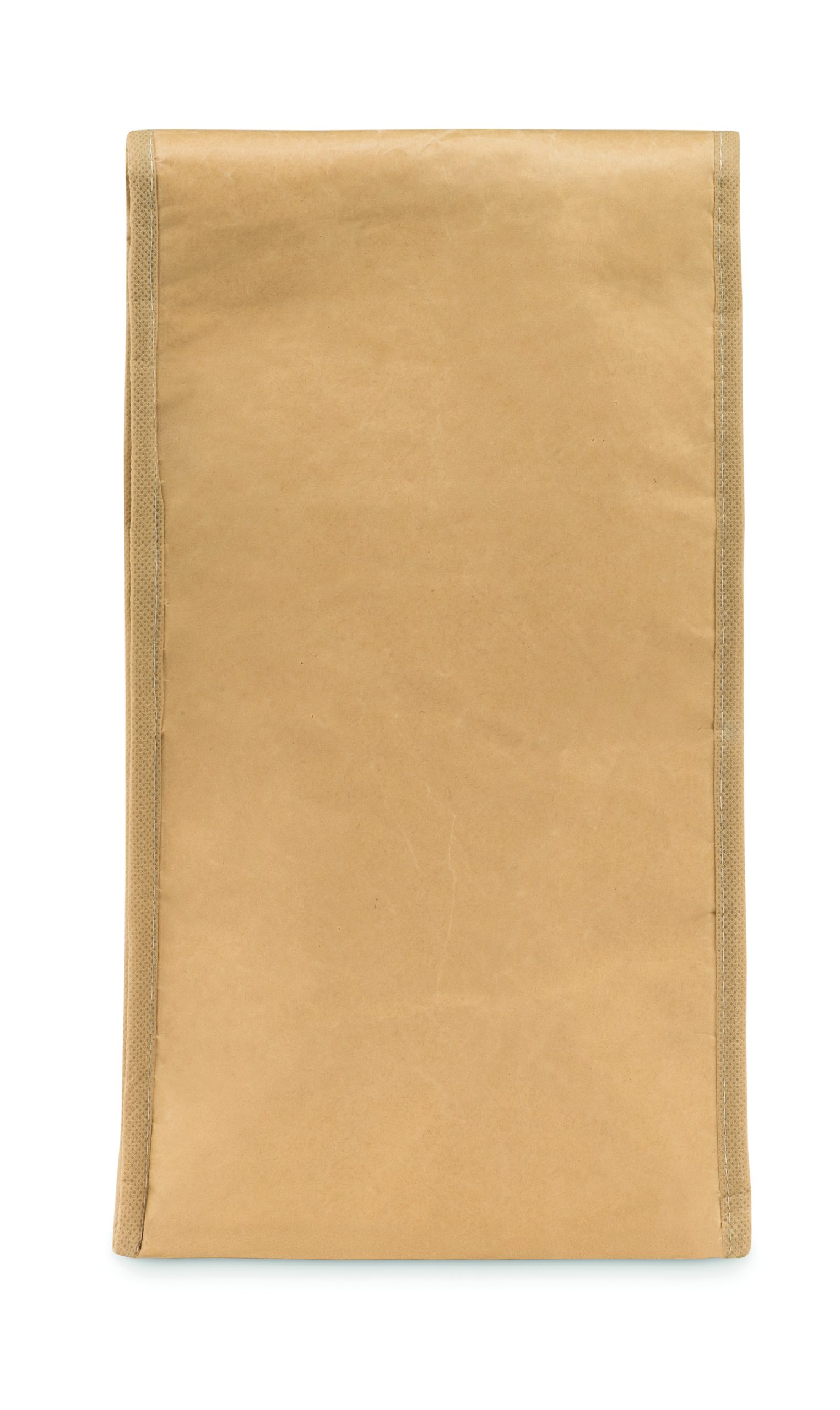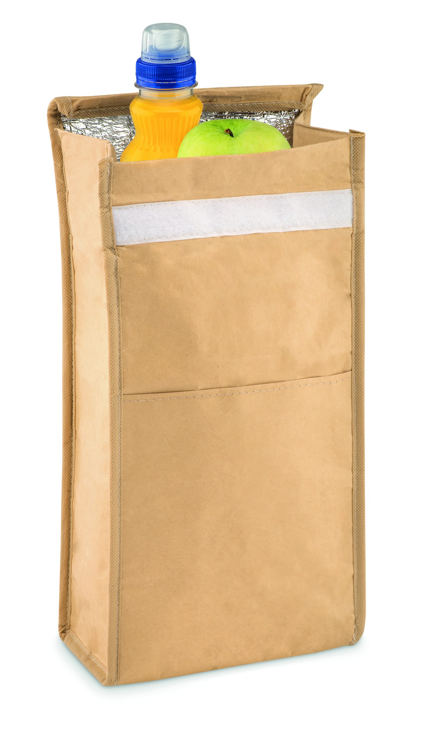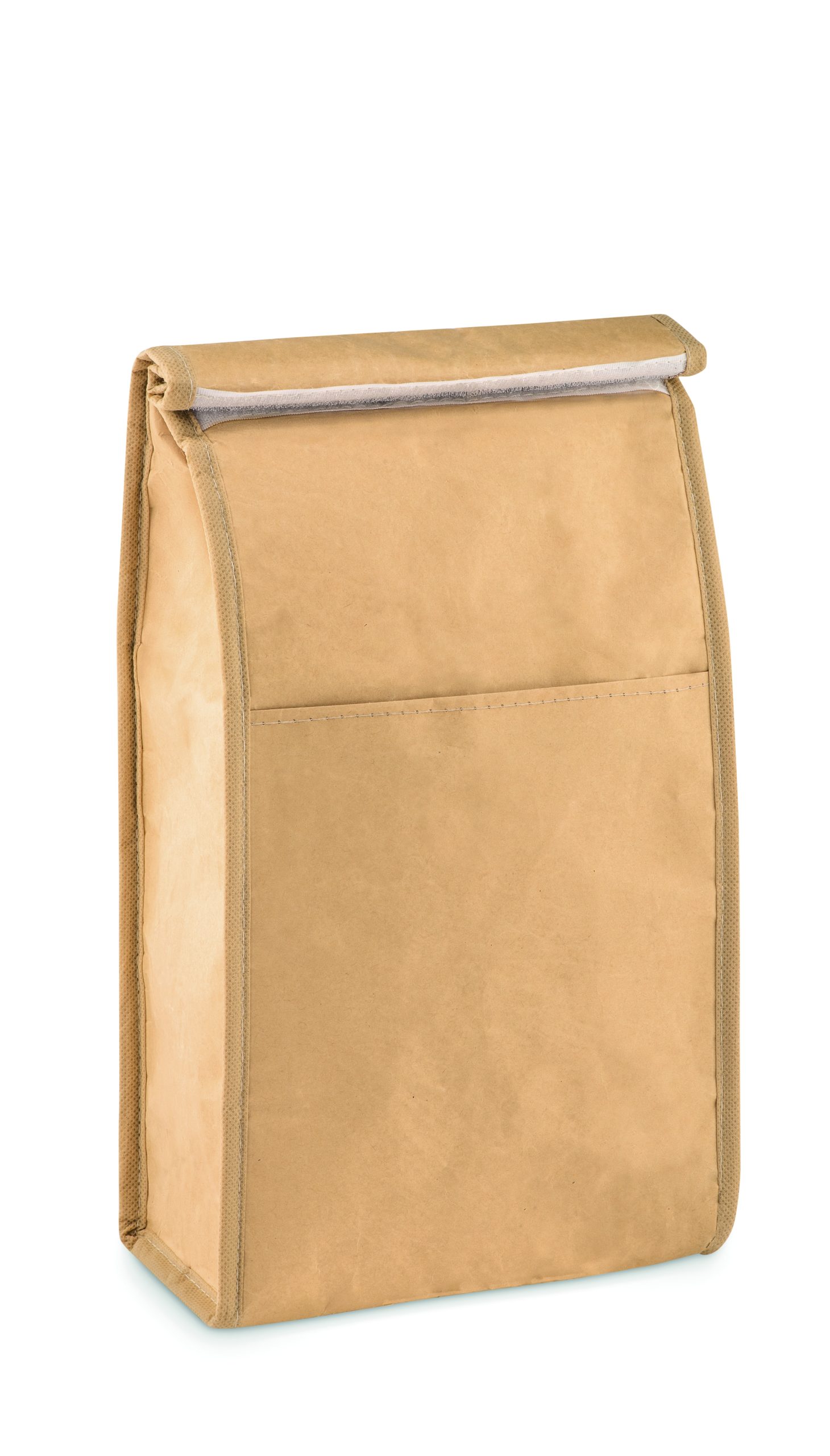 Woven recycled paper woven cooler lunch bag with front pocket. Isolation material: PE foam layer. Capacity 3L.