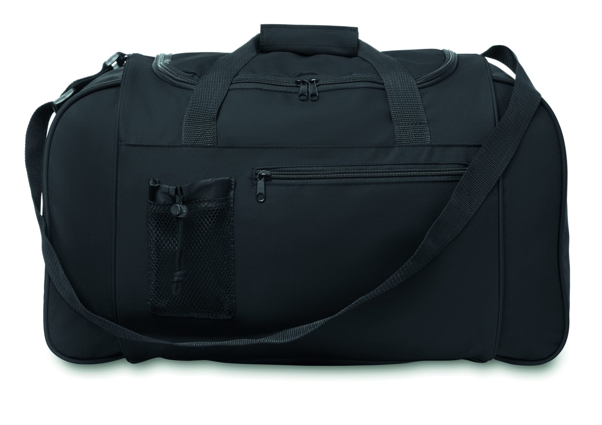 Sport or travelling bag in 600D polyester with front pocket and adjustable and detachable shoulder strap.