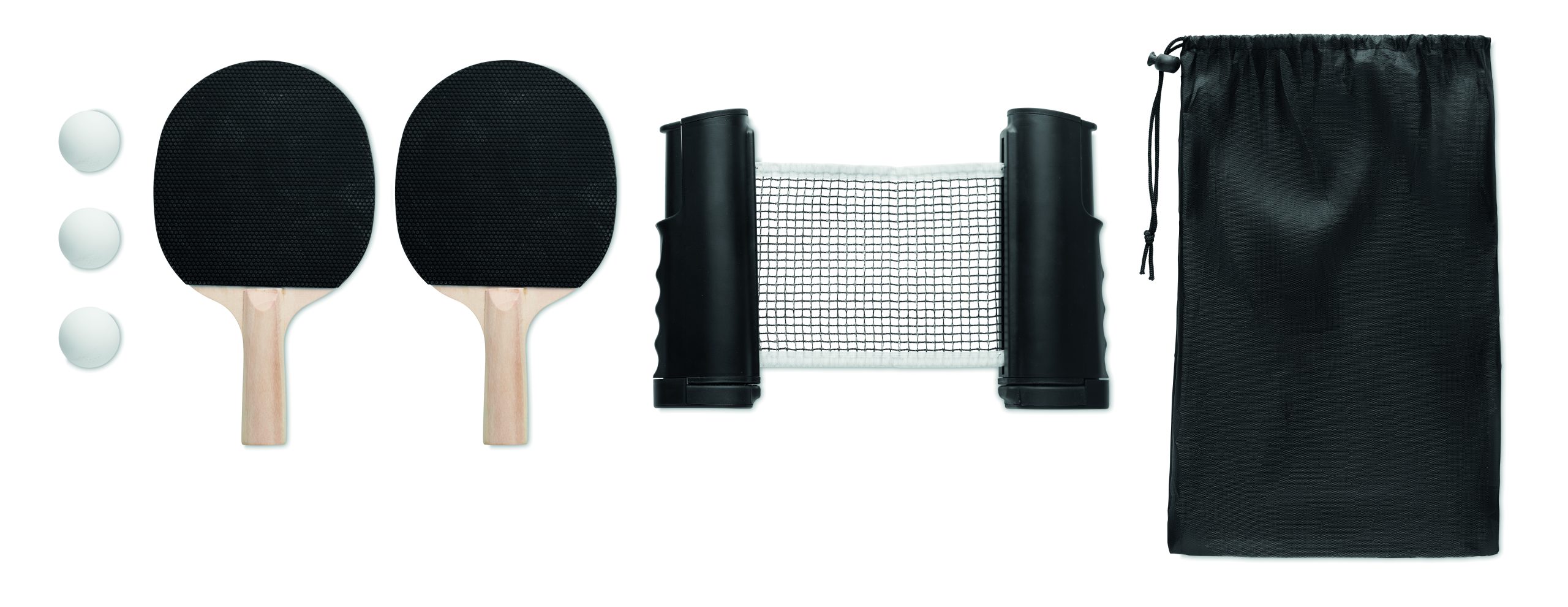 Roll net table tennis set. Includes 3 balls, 2 bats and 1 extendable net presented in RPET pouch.