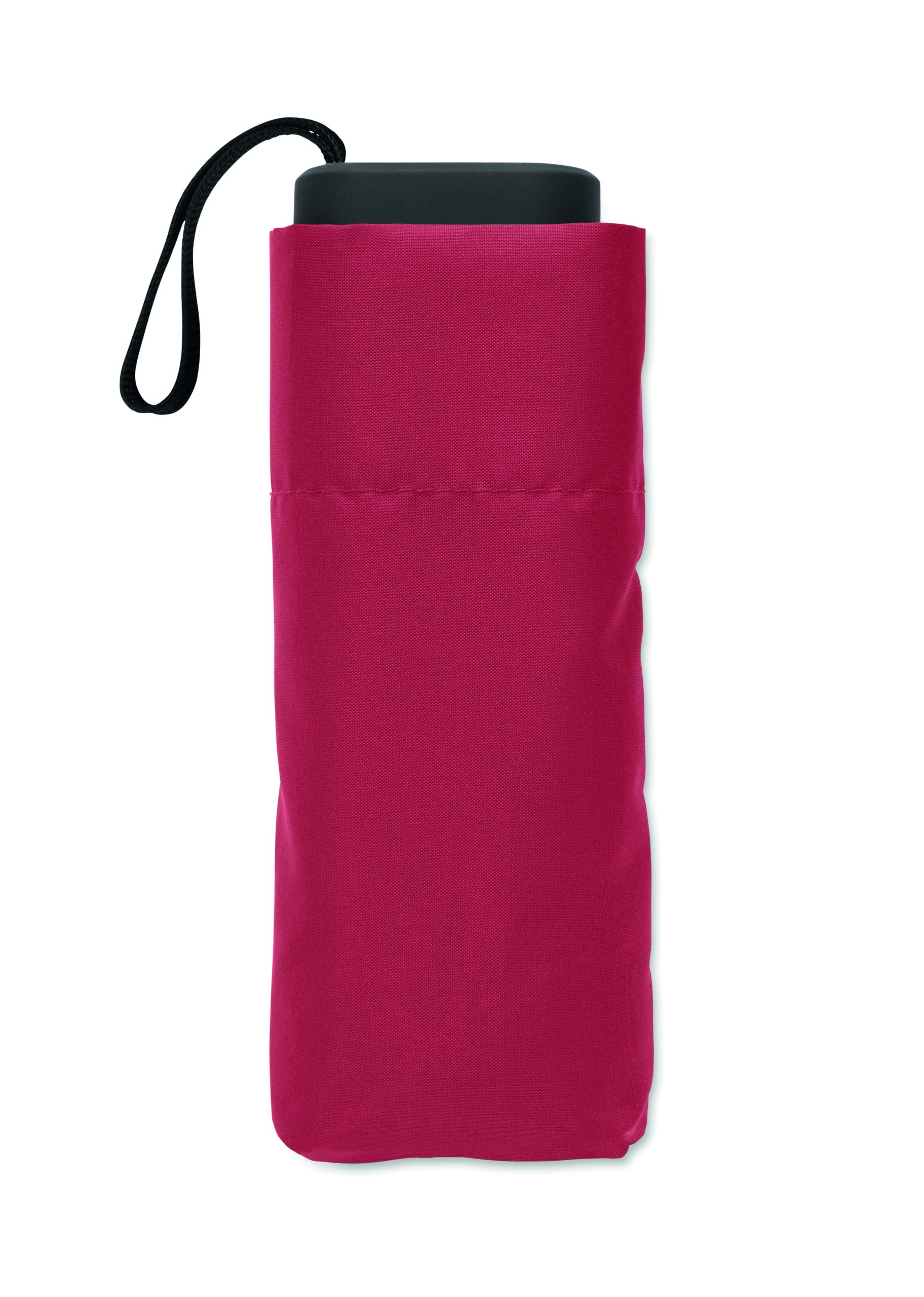 19-inch 5-fold manual umbrella made of 190T pongee with matching pouch. It has a metal and fibreglass windproof frame, black rubberized handle with wrist strap, and compact 17 cm folded size.