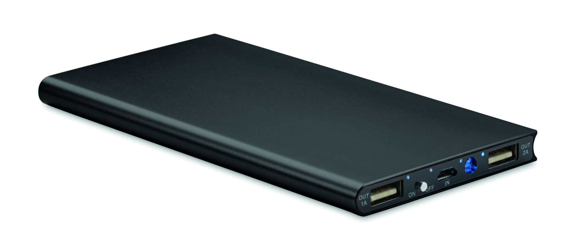 Powerbank. 8000 mAh. Recycled aluminium and ABS. Outputs: USB-A up to 10W. Input: USB-A 5W. 4 LED indicators. Built-in Micro USB plug. USB-A to Micro USB cable (30 cm) included.