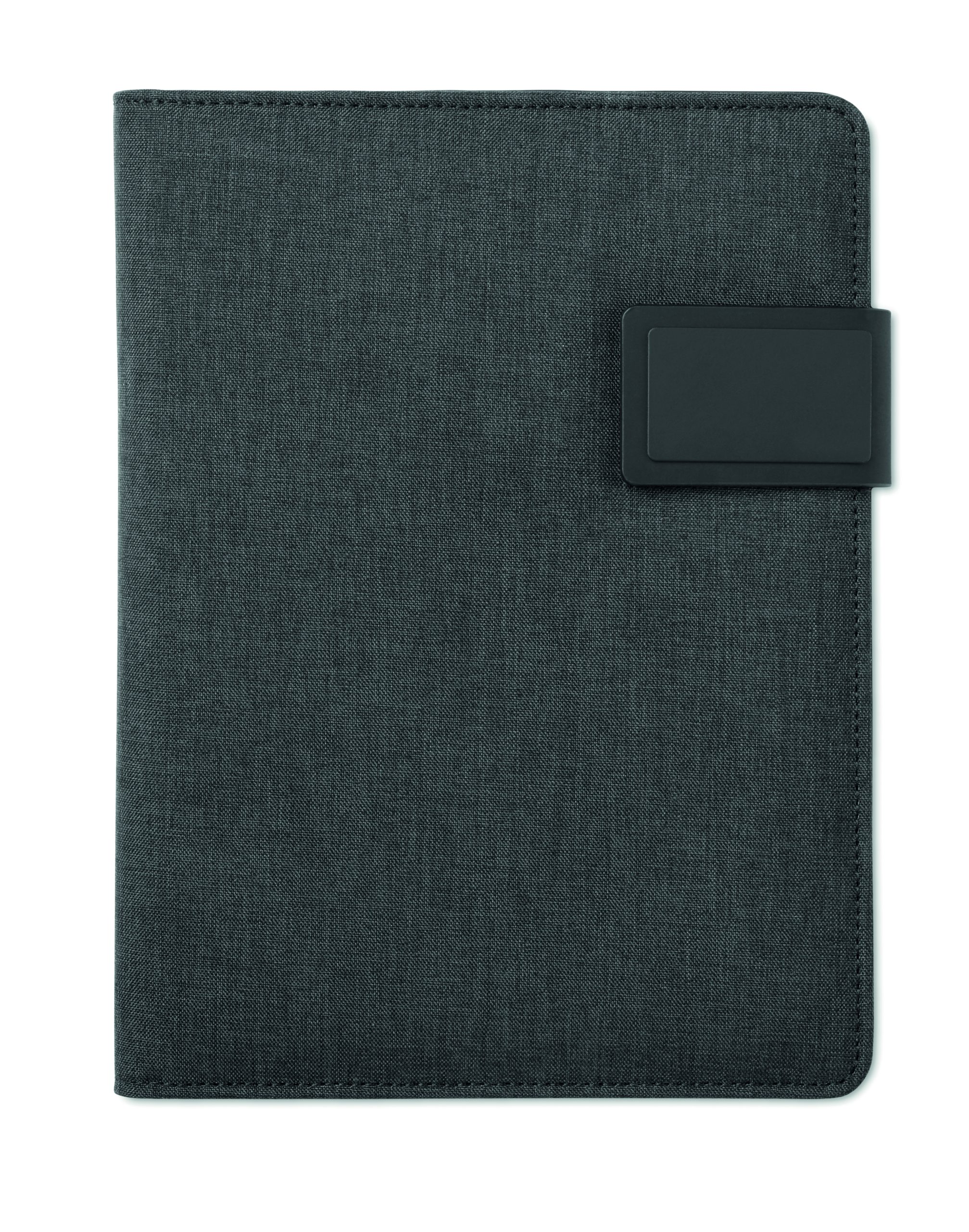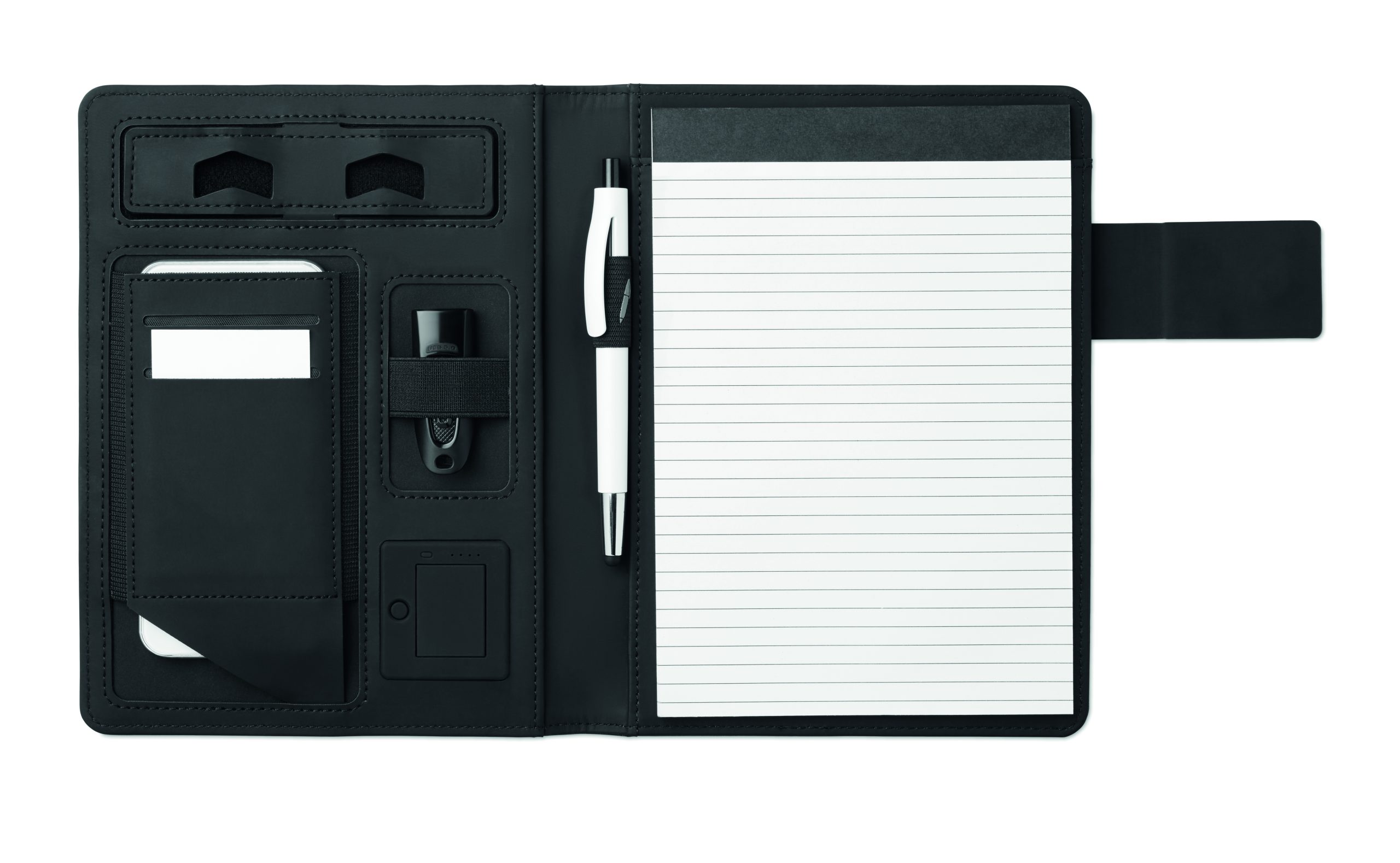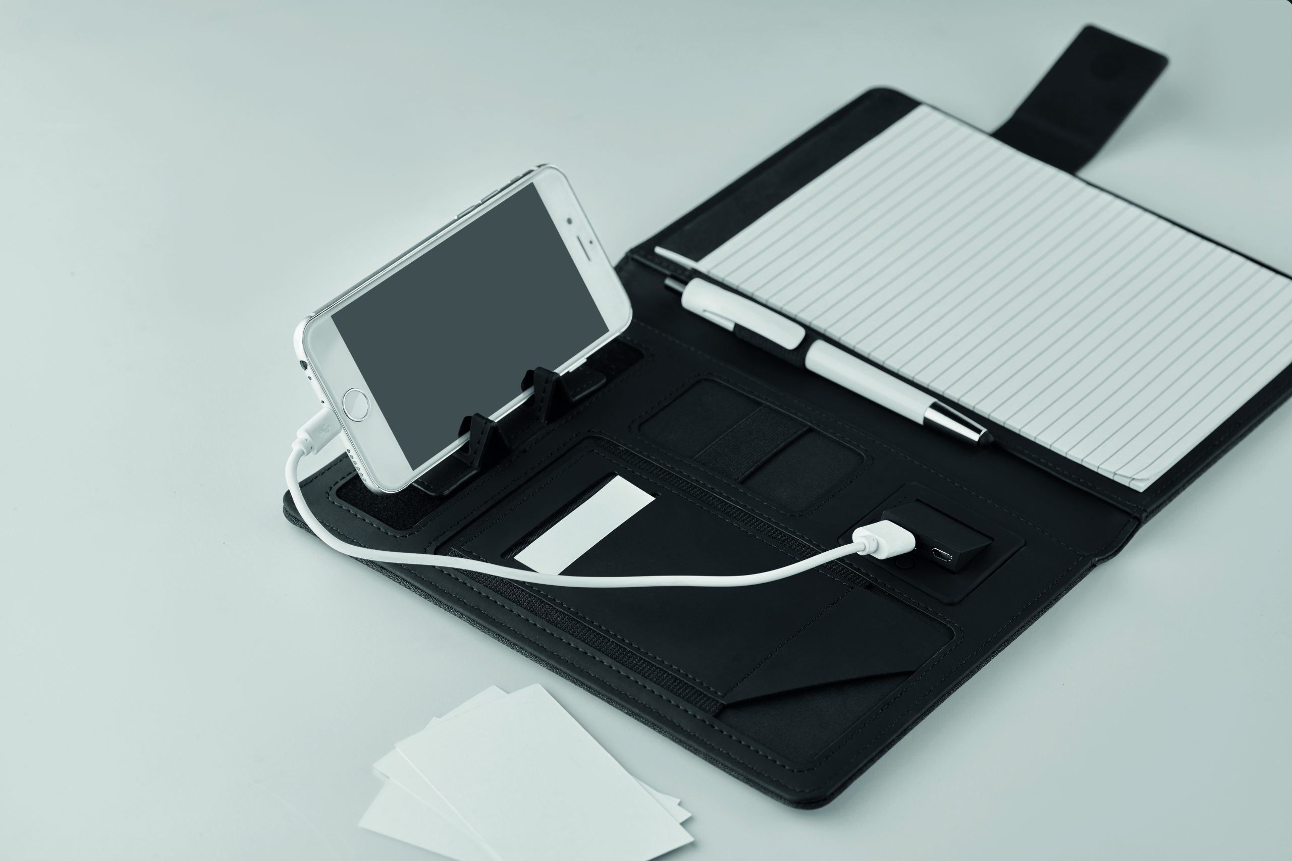 A5 conference folder with linen-PU cover. 4000 mAh power bank. Built-in micro USB to a Type C connector. 20 lined sheets notepad. Multiple internal compartments. Magnetic closure. Elastic pen holder.
