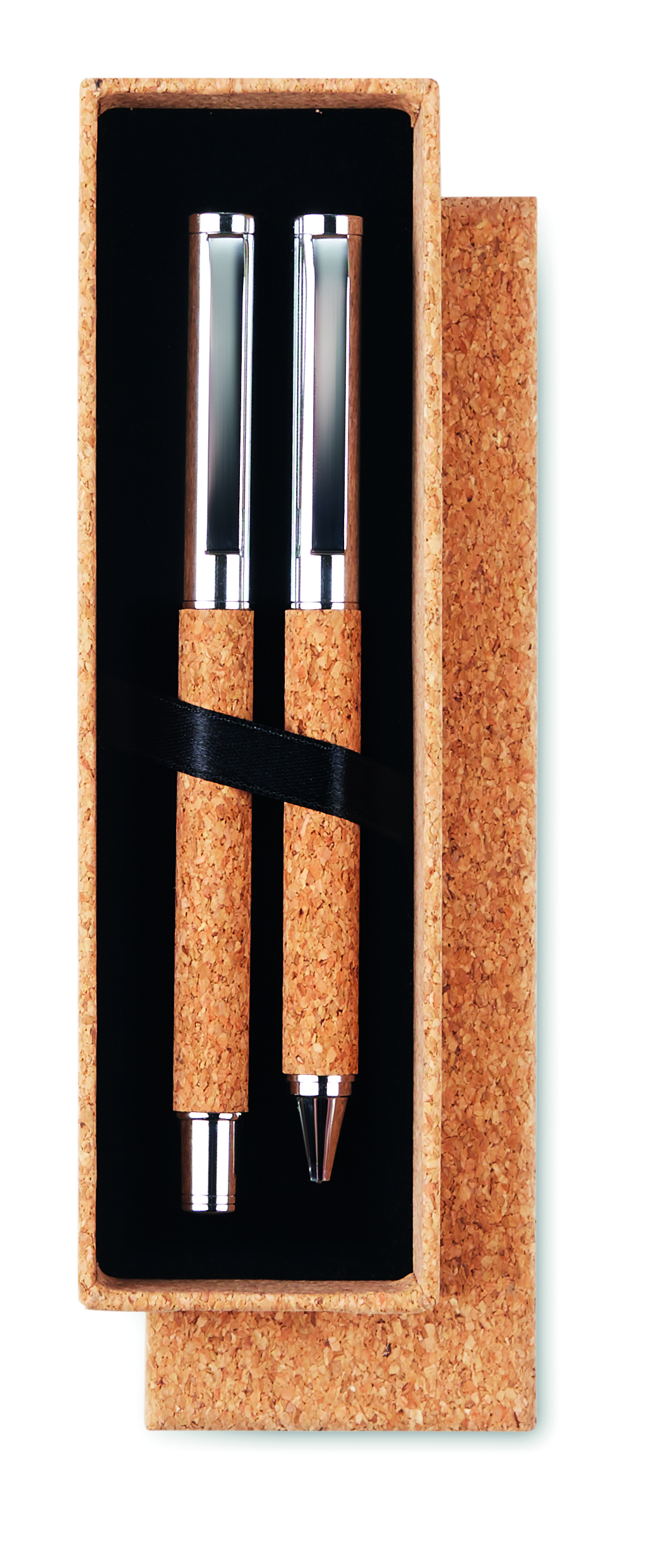 Metal pen set with ball pen (twist mechanism) and roller ball (open cap) with cork barrel. Presented in matching cork box. Blue and black ink respectively. Cork is a natural material, due to its structural nature and surface porosity the final print result per item may have deviations.