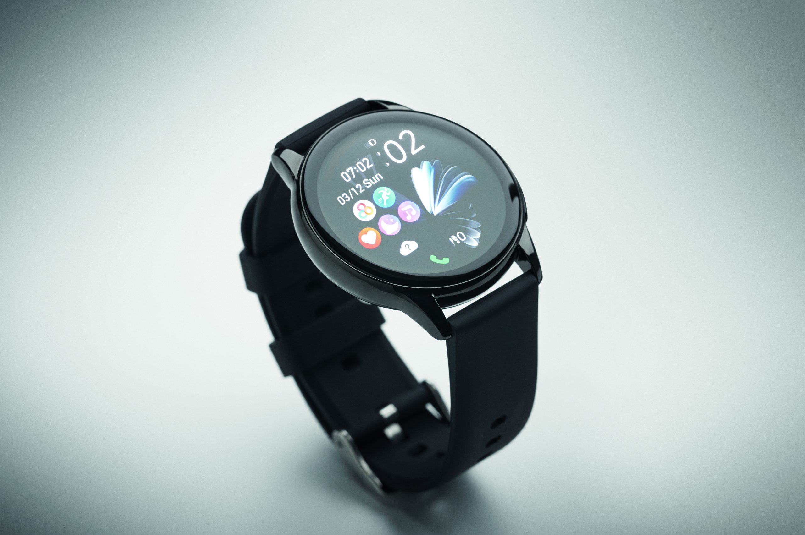 IP67 waterproof wireless smartwatch in zinc alloy with silicone strap. 1.32 inch AMOLED touch screen. Rechargeable Li-Pol 300 mAh battery. Requires a free app (FitCloudPro available in both iOS and Android).