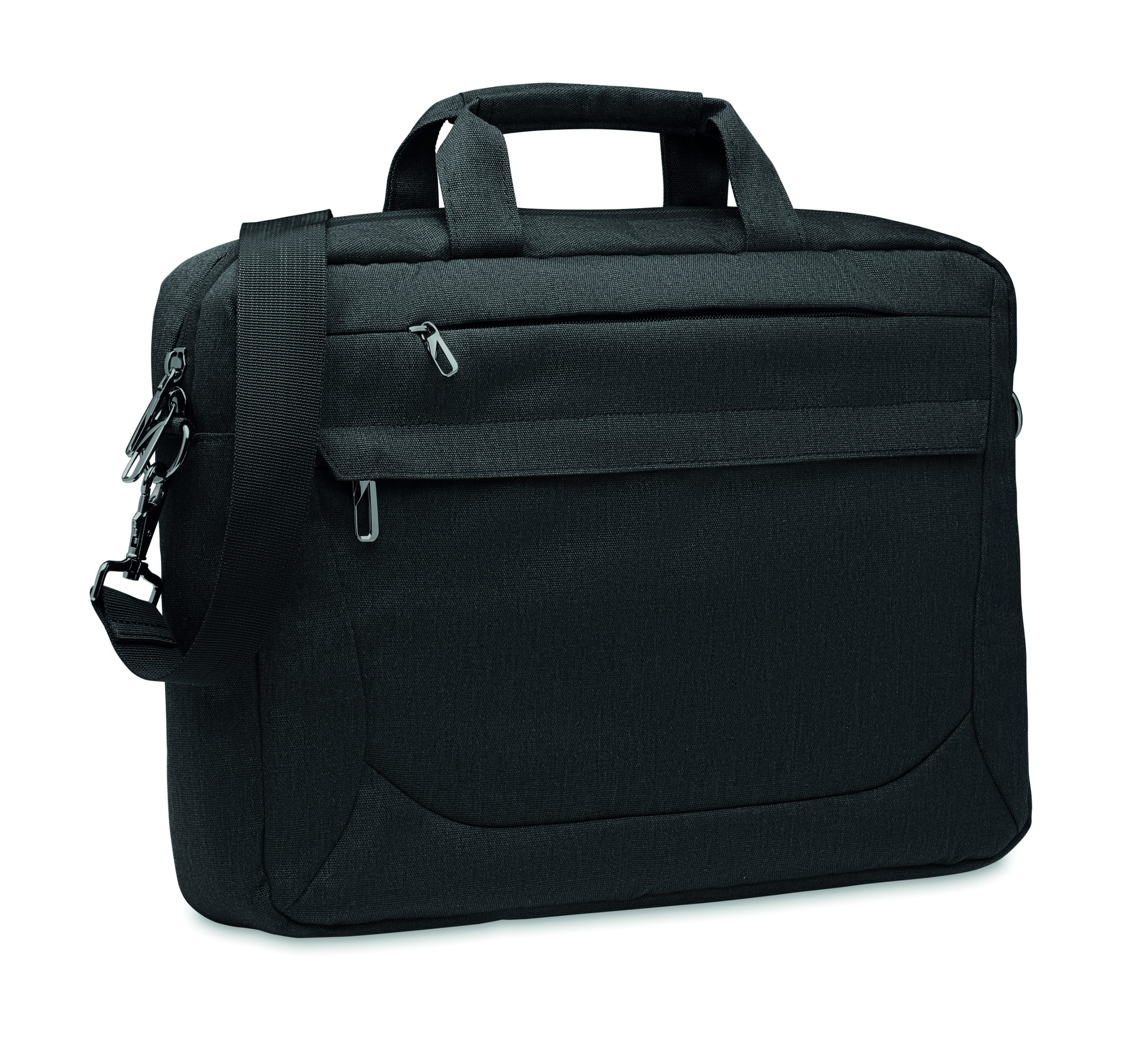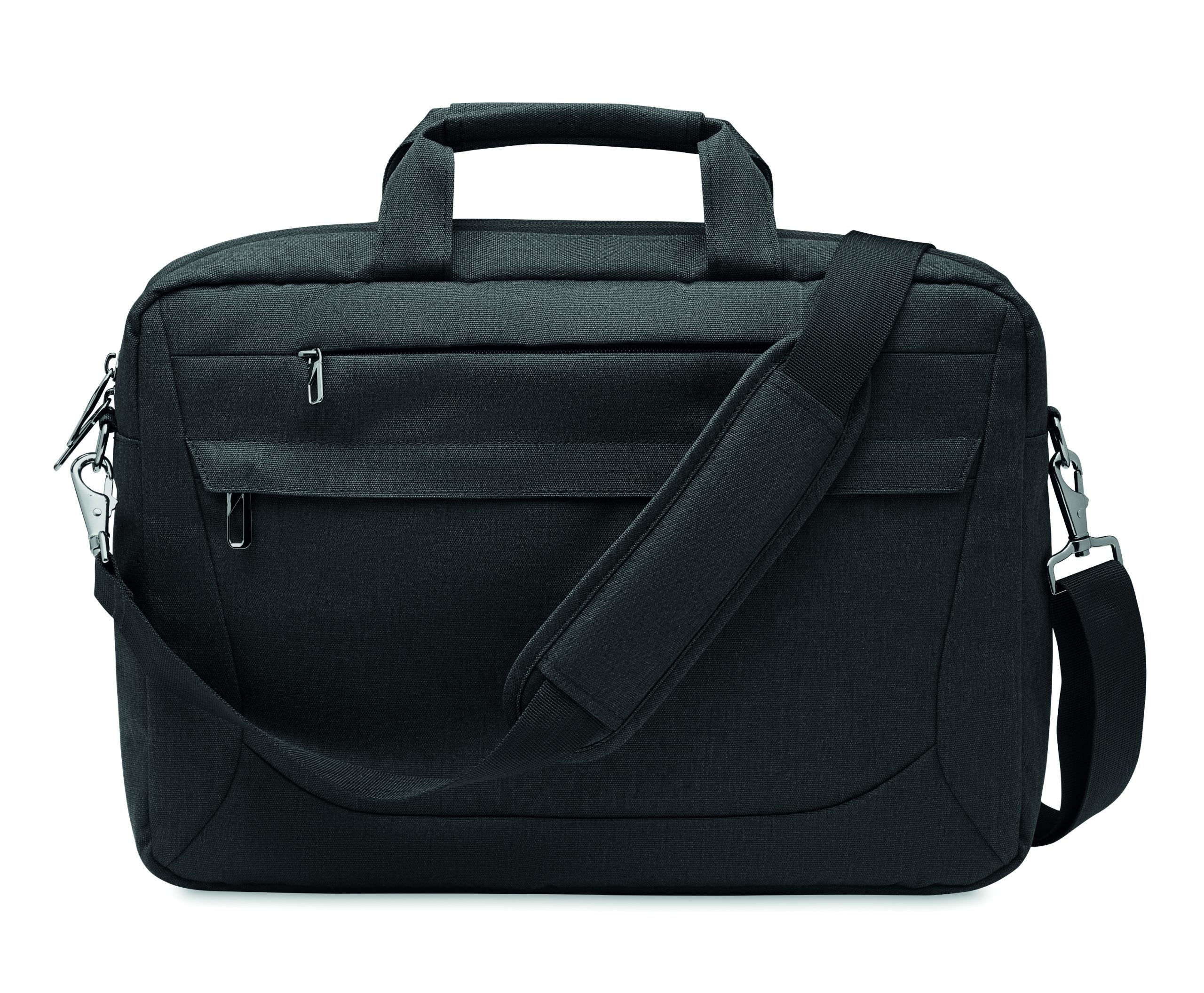 15 inch laptop bag in 600D RPET polyester. 2 main internal compartments for both laptop as tablet and large zippered front pocket. It has a small zippered pocket. Detachable and adjustable shoulder straps. Trolley holder on reverse side.