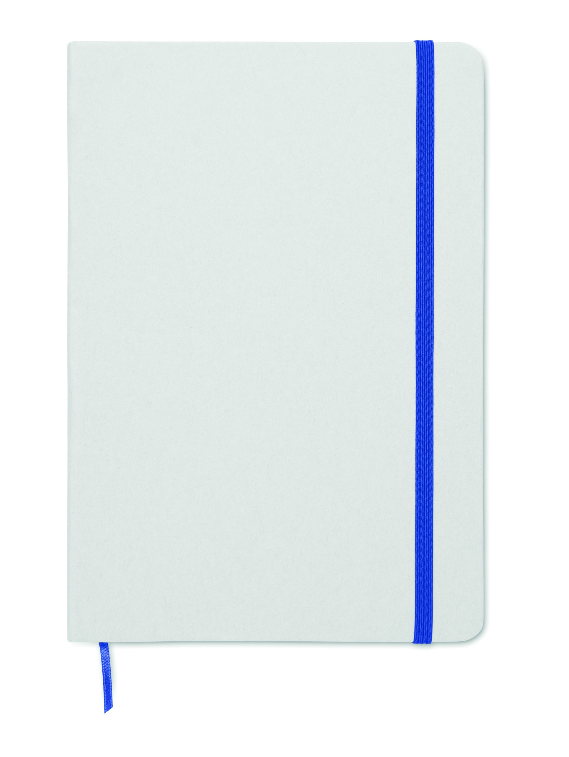 A5 notebook with hard cover made of 70% recycled milk carton pack and 30% recycled paper. White cover. Casebound. 160 lined recycled paper pages (80 sheets). Elastic closure strap, ribbon bookmark matching with revealed colour. After laser engraving the colour is revealed.