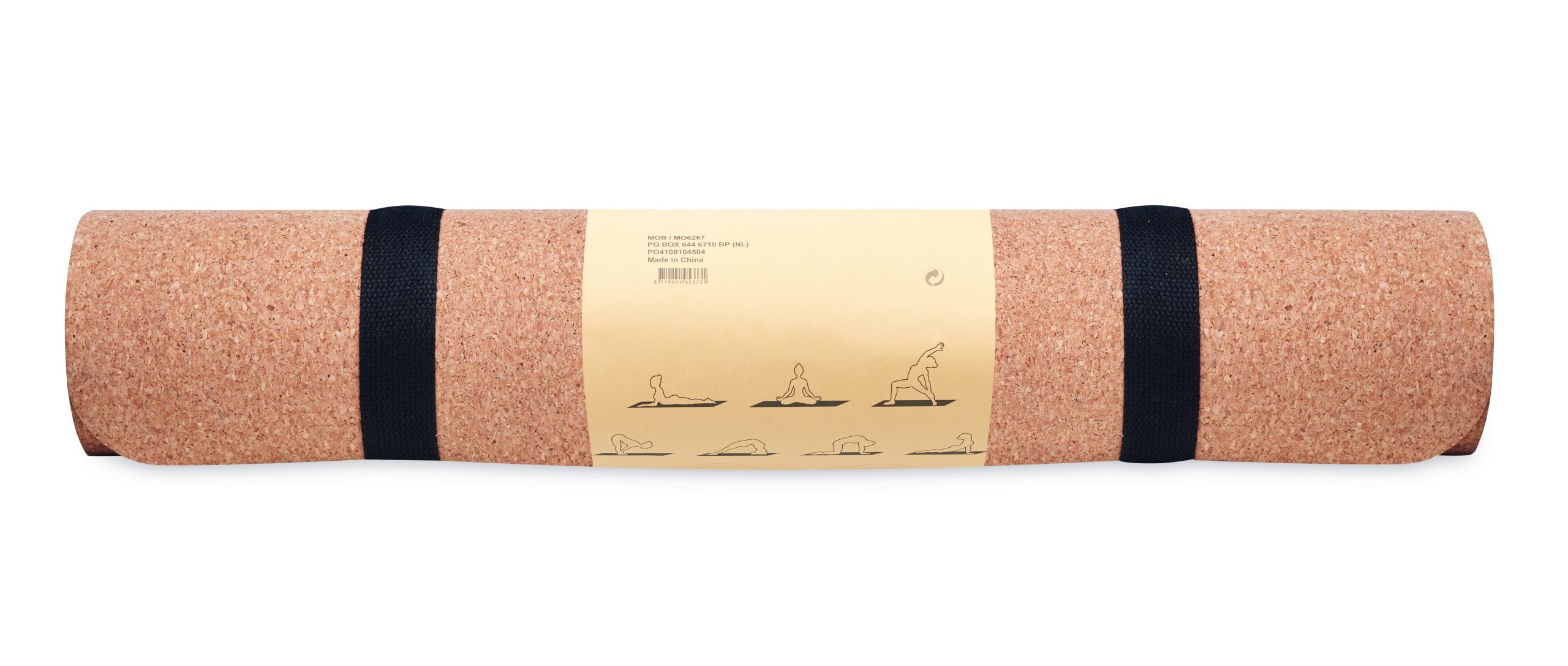 Yoga exercise mat made of cork and TPE material presented with paper wrap with instructions. Thickness 0,4cm. Including a cotton exercise rope/strap holder. Cork is a natural material, due to its structural nature and surface porosity the final print result per item may have deviations.