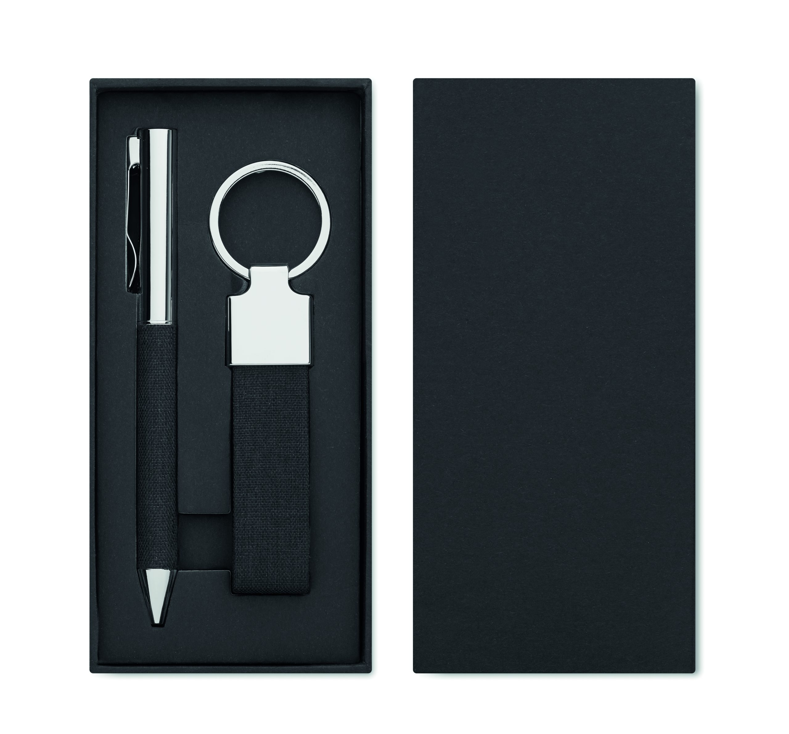 2 piece gift set in gift box. Including metal twist ball pen with RPET polyester detail and RPET polyester key ring. Blue ink.