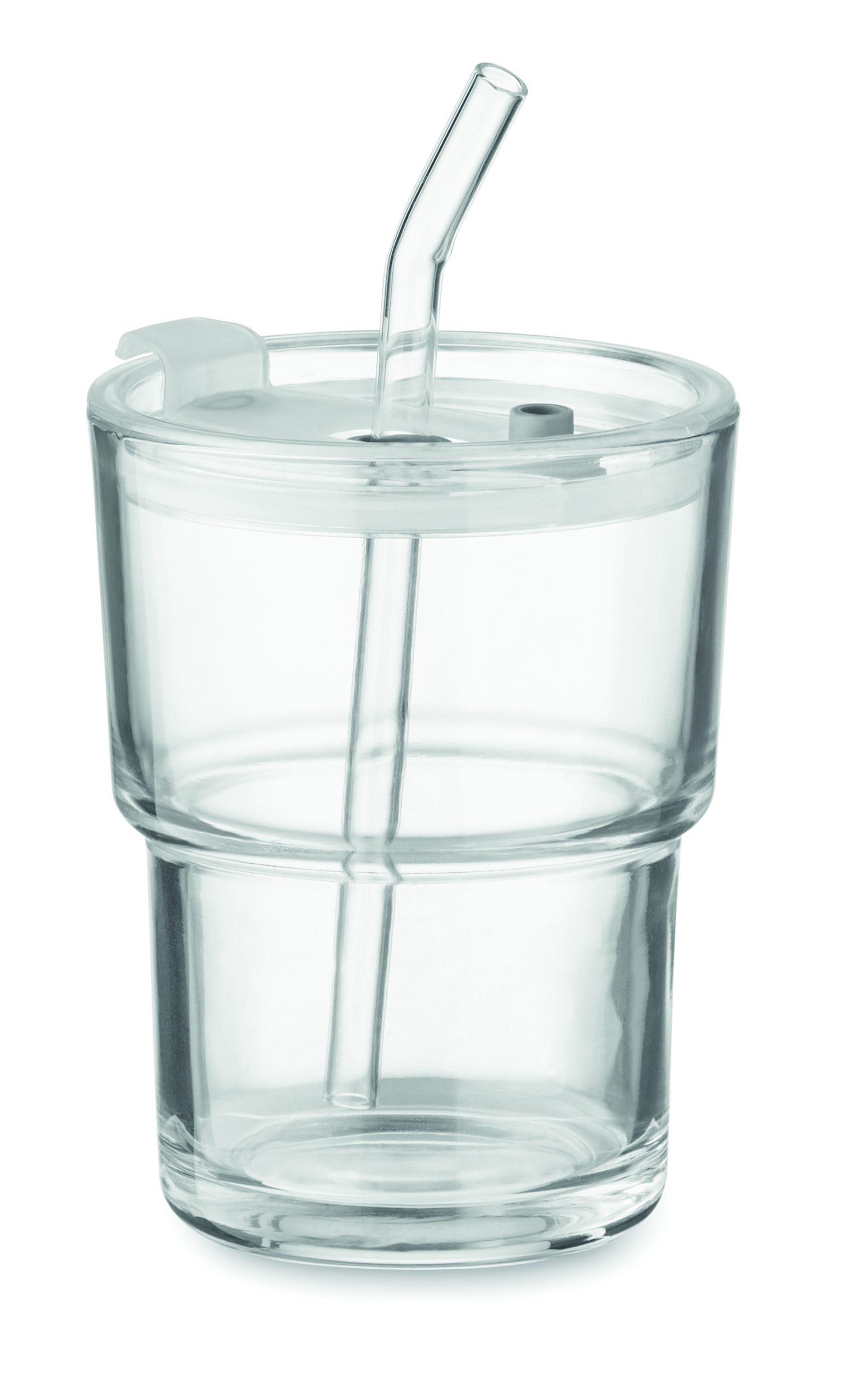 Glass tumbler with lid including removable glass straw. Straw socket and direct drink opening leak-free lid. Capacity 400 ml.