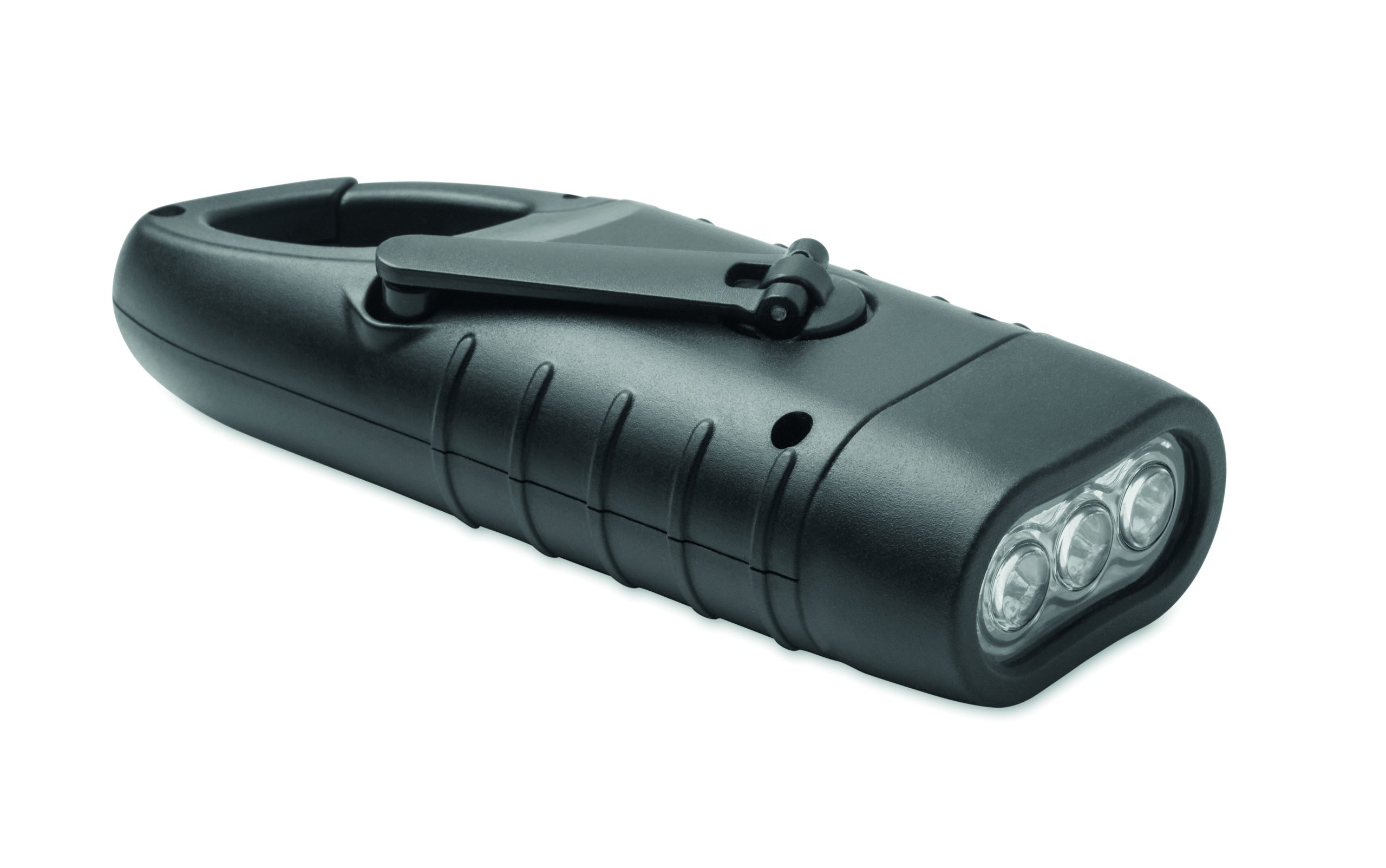 3 white LED torch powered both solar panel and dynamo crank with 40 mAh battery in recycled ABS.