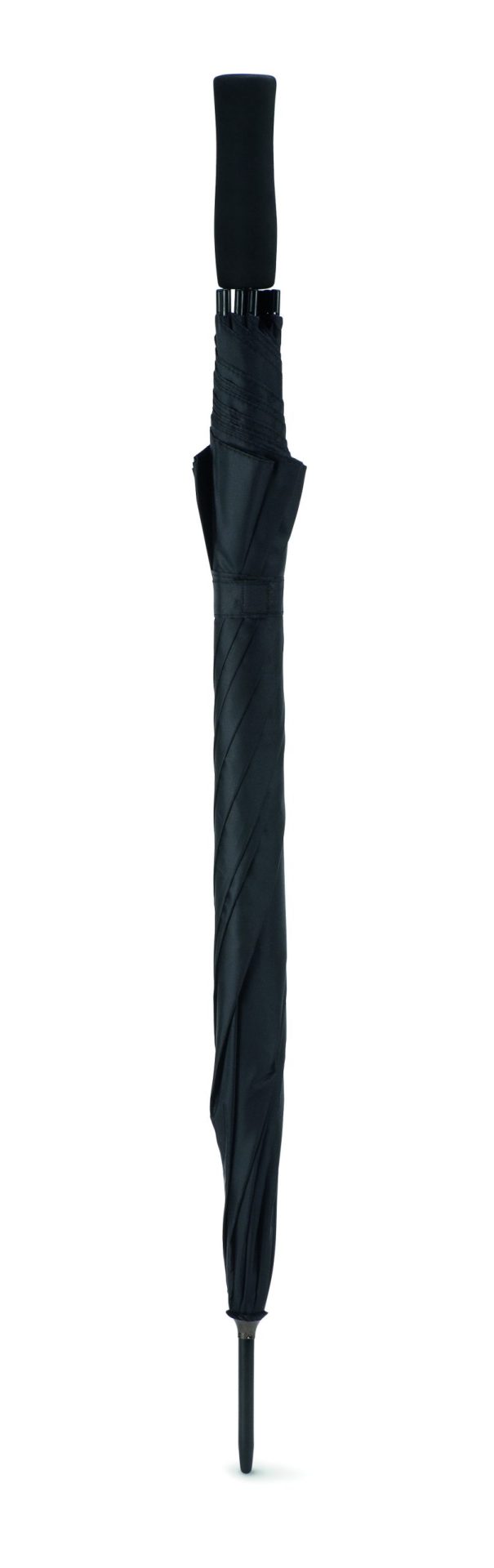 23 Inch auto open umbrella in 190T pongee with black plated metal shaft and ribs. Black plastic tips. Straight black EVA handle. Manual closure.