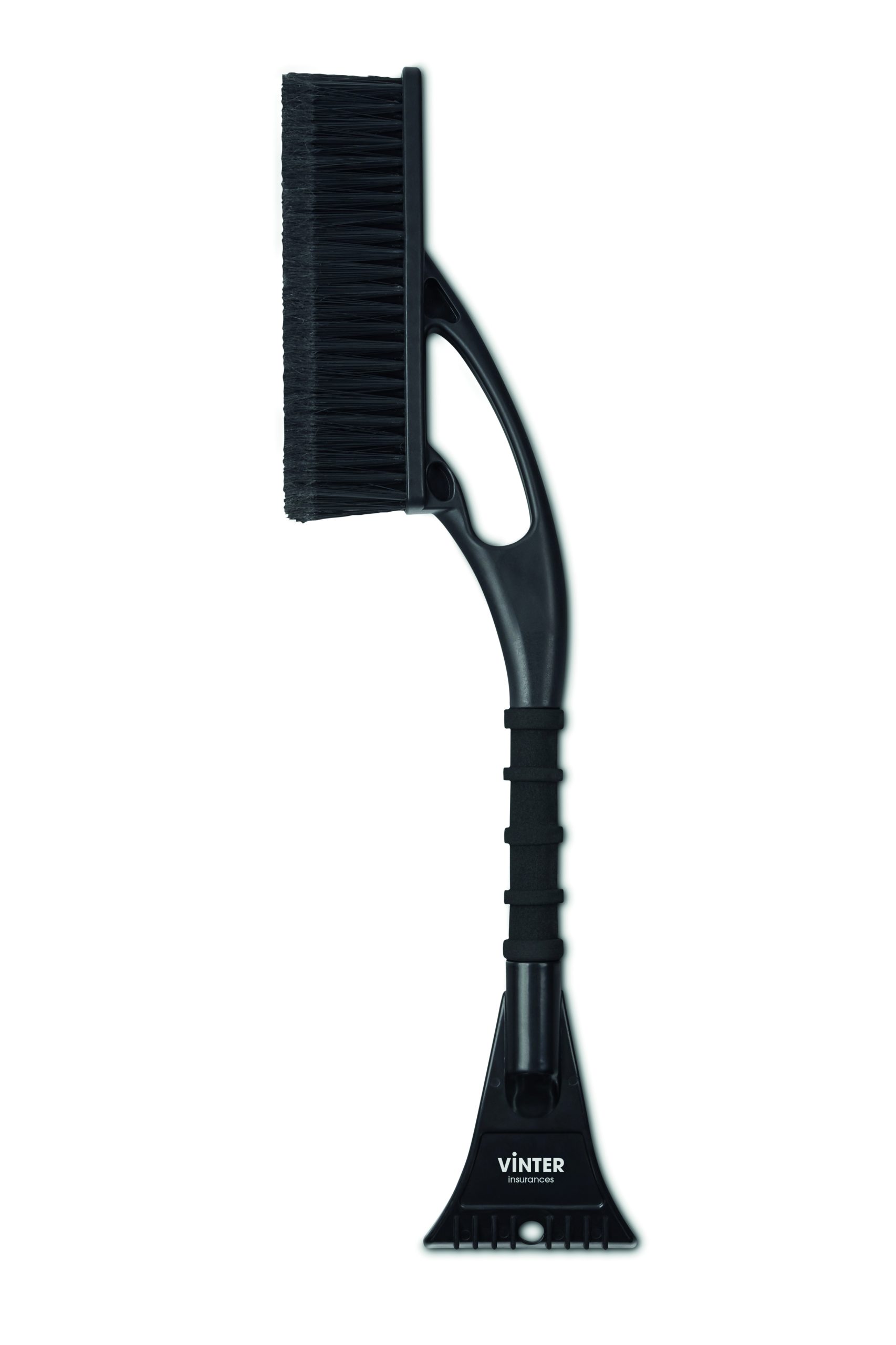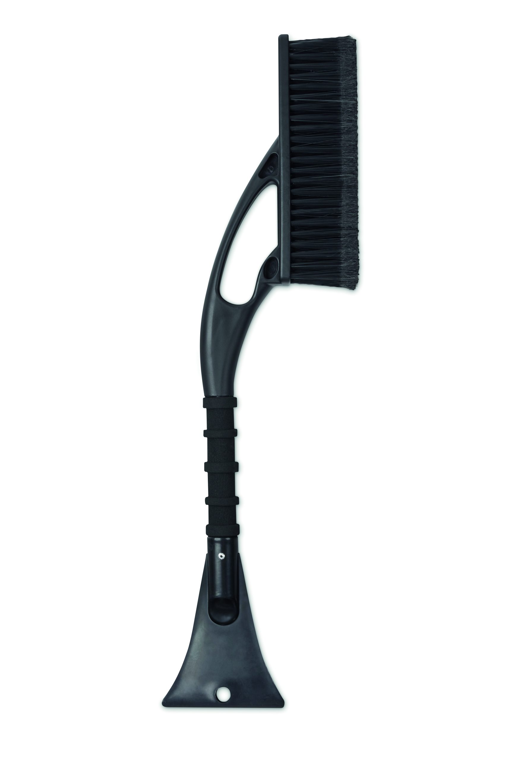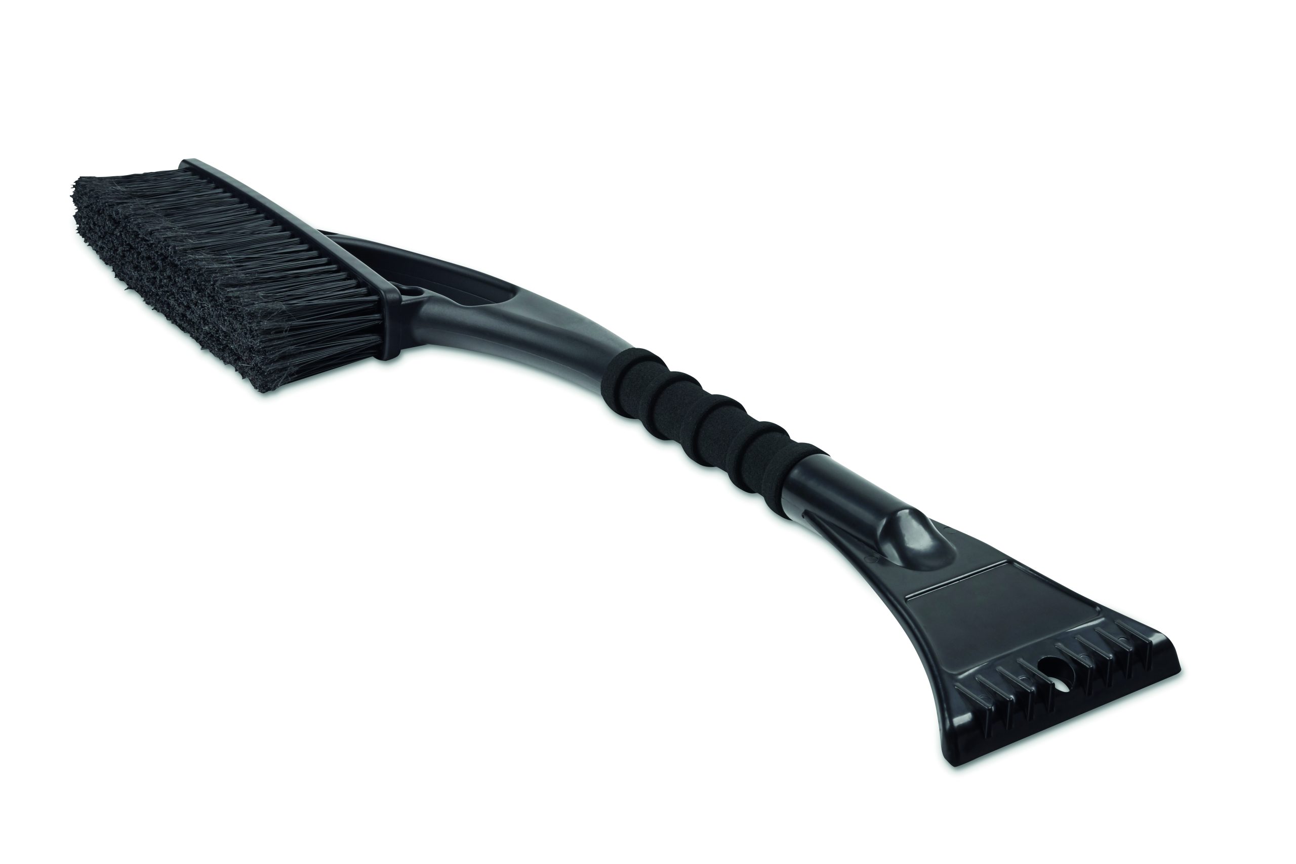 Snow brush in PET with soft finish hair on the tips with integrated ice scraper in ABS and foam grip handle.