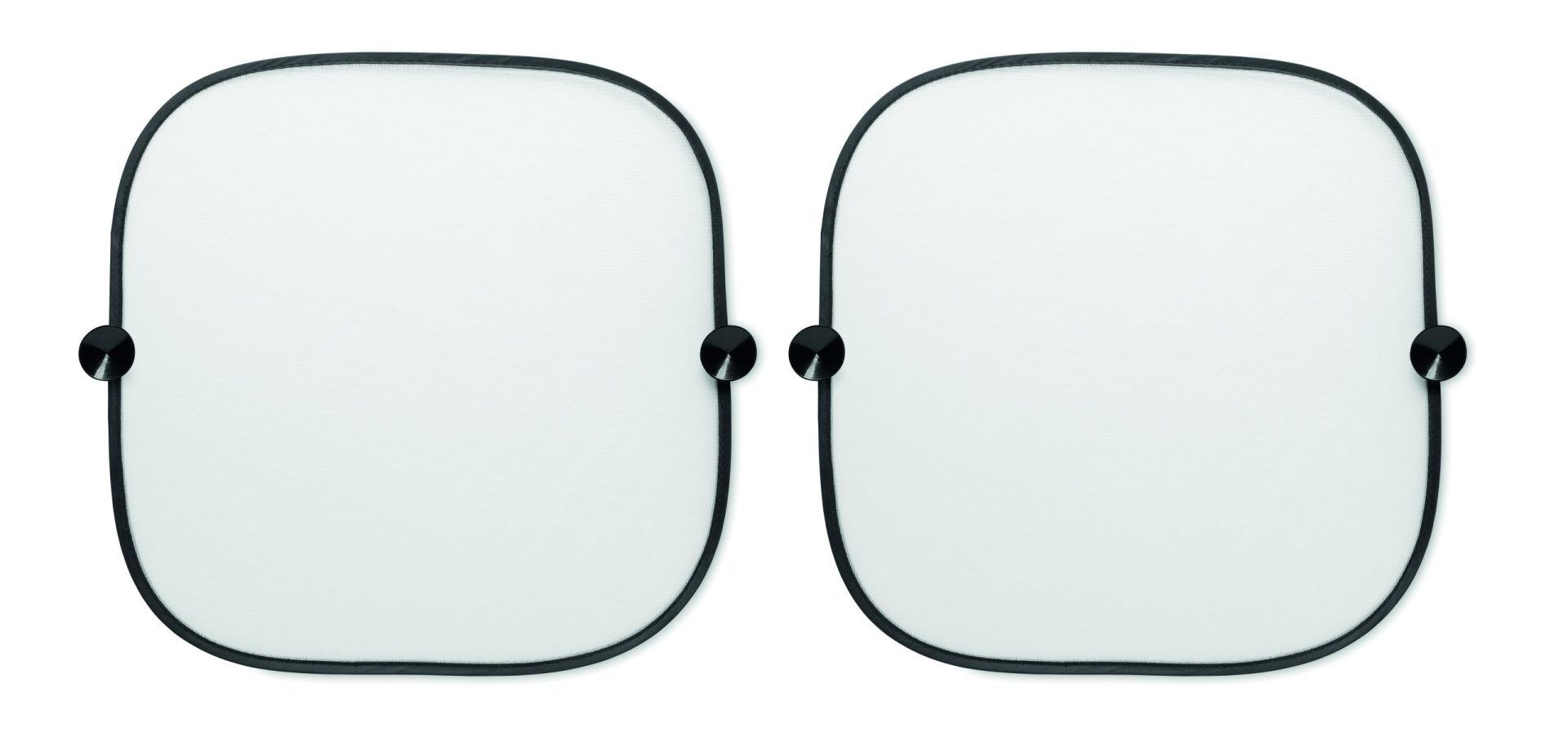 Set of 2 car window shades made of polyester. Includes 2 suction cup holders. Perfect for both winter and summer to keep the weather at bay. This will keep your car cool during the summer by reflecting the sunlight away, and will keep the frost off your windshield when placed on the outside by offering a layer of protection.
