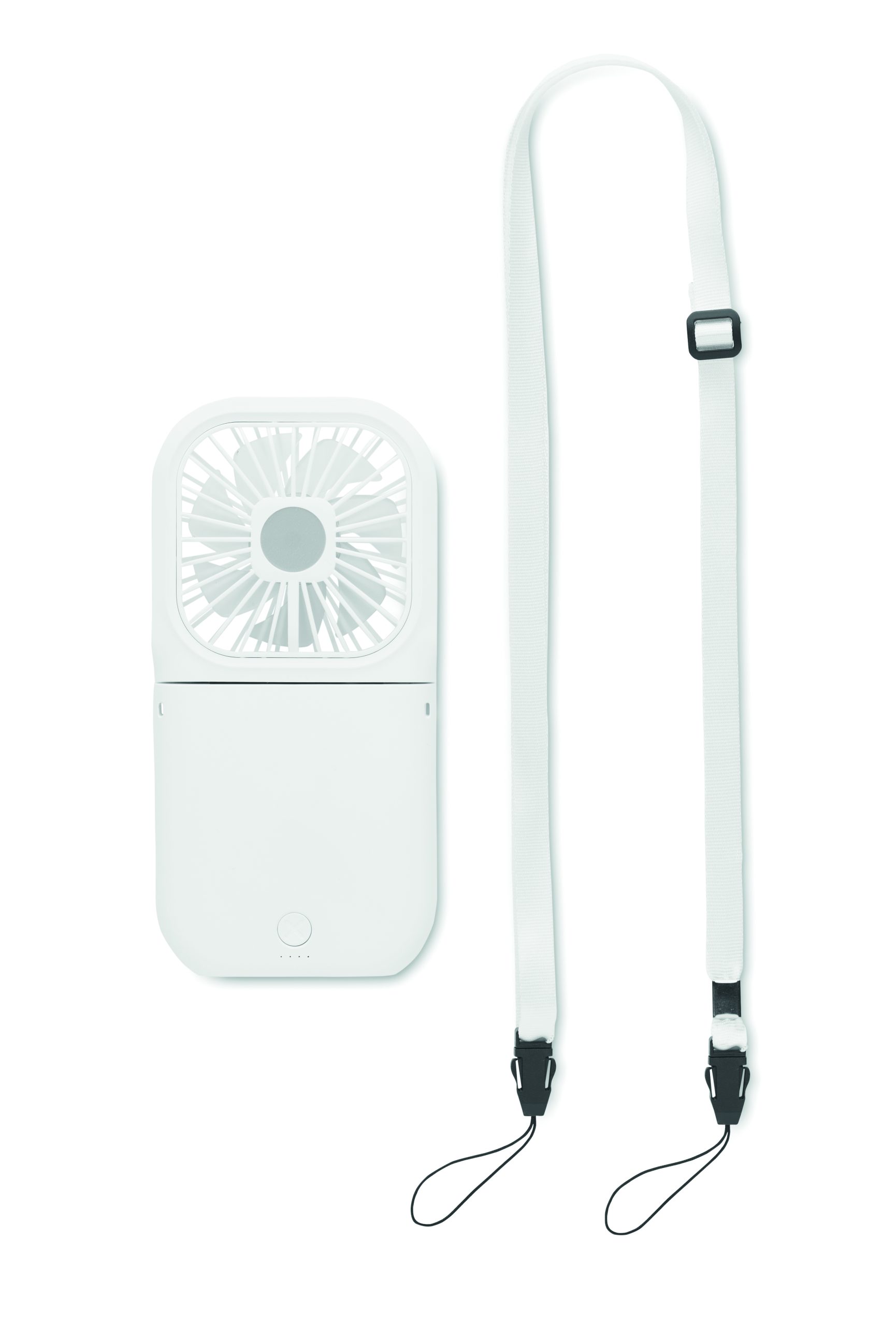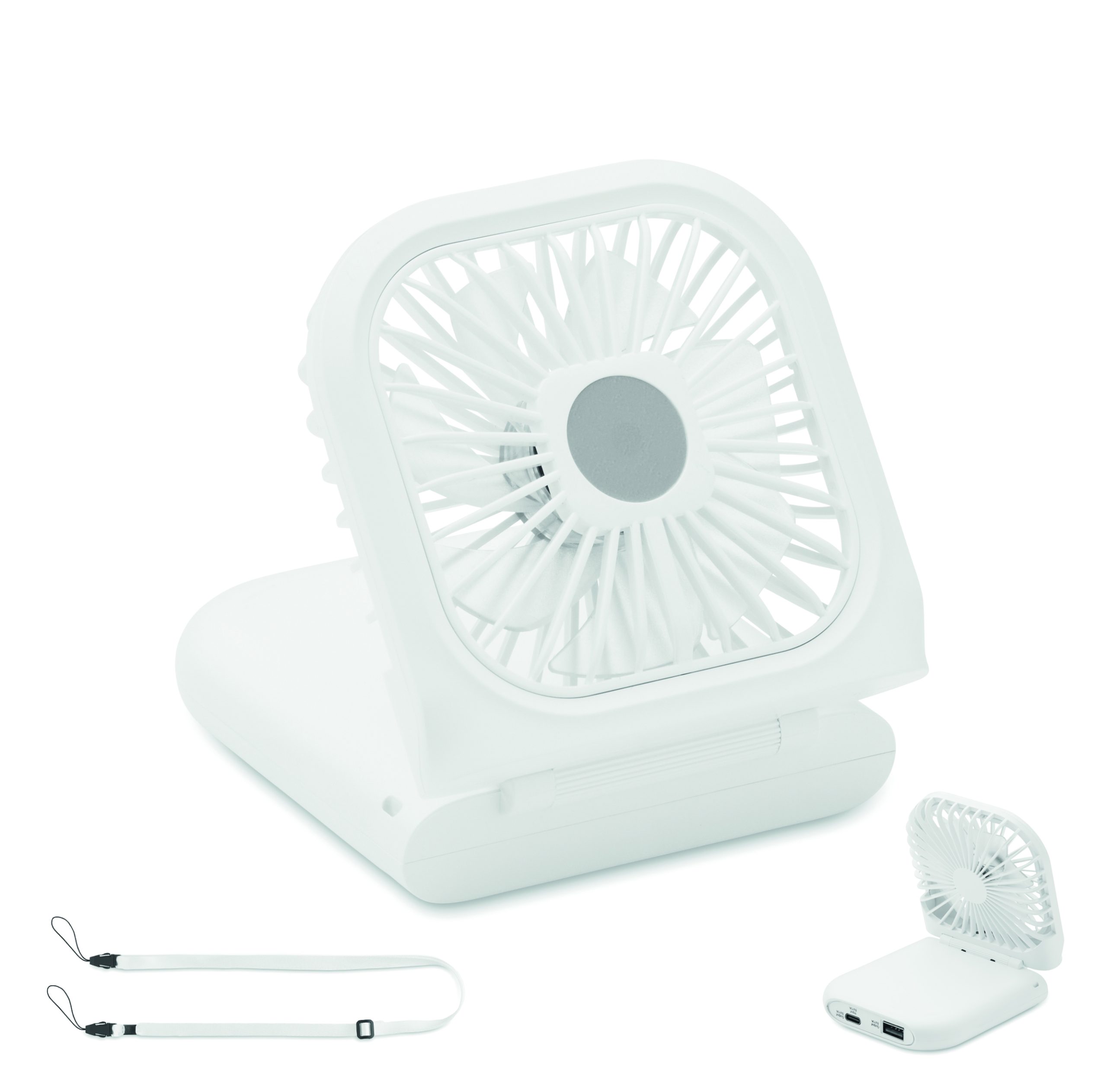 Portable foldable fan with adjustable neck strap. 3 speed settings. Can also be used as desk fan when folded. Including a 3000 mAh power bank. In/Output: Type-C & output type A.