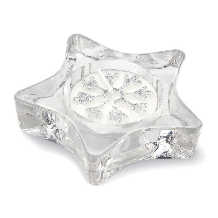 Star shaped glass tea light candle holder in silver box with transparent cover and decorative ribbon. Tea light included.