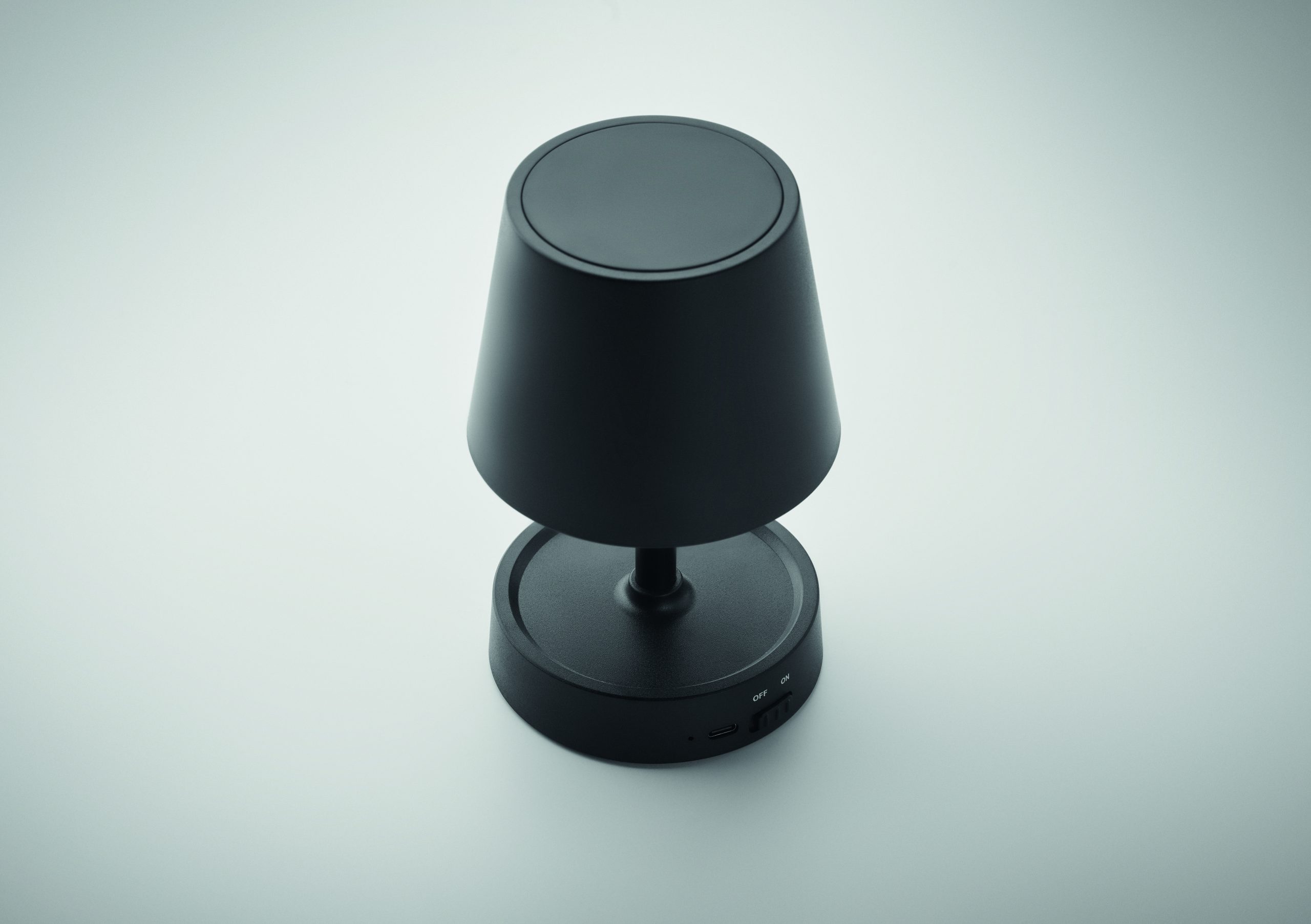 Retractable and rechargeable USB table lamp in ABS. Includes 12 LED lights with adjustable light intensity and stepless dimming. Built-in battery: 1200 mAh (6hr working time after fully charged). Including USB Type-A to Type-C charging cable.