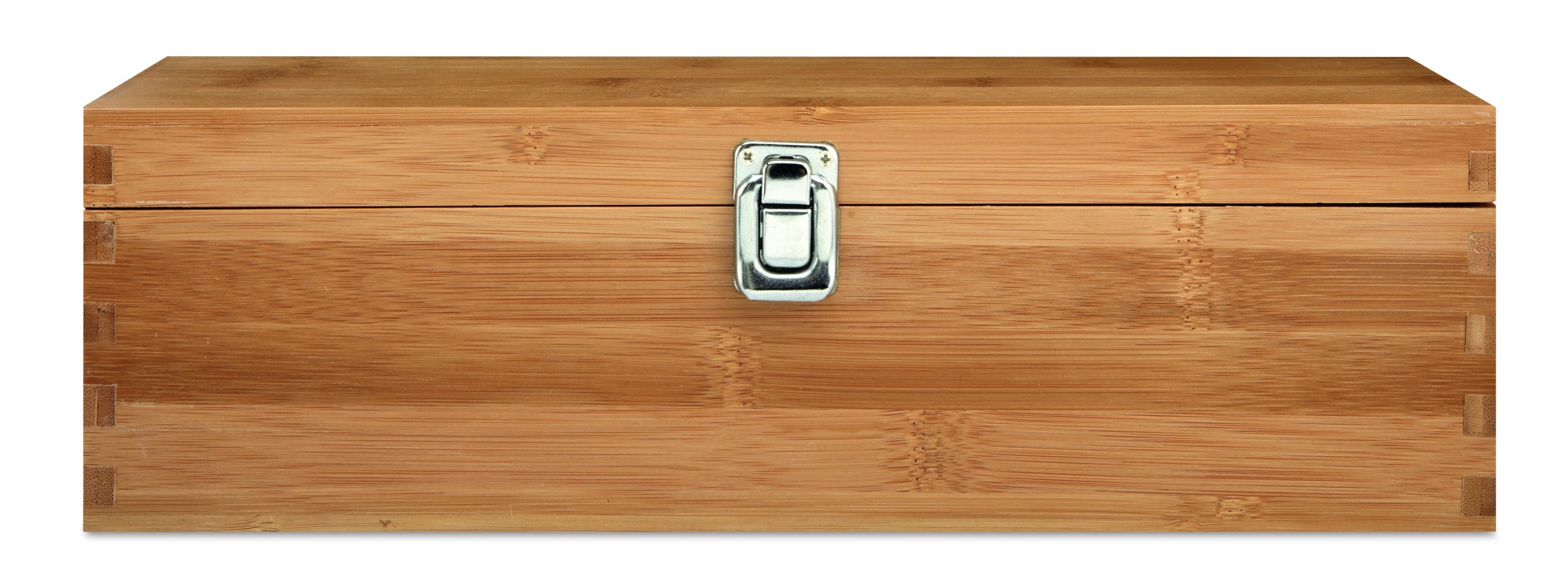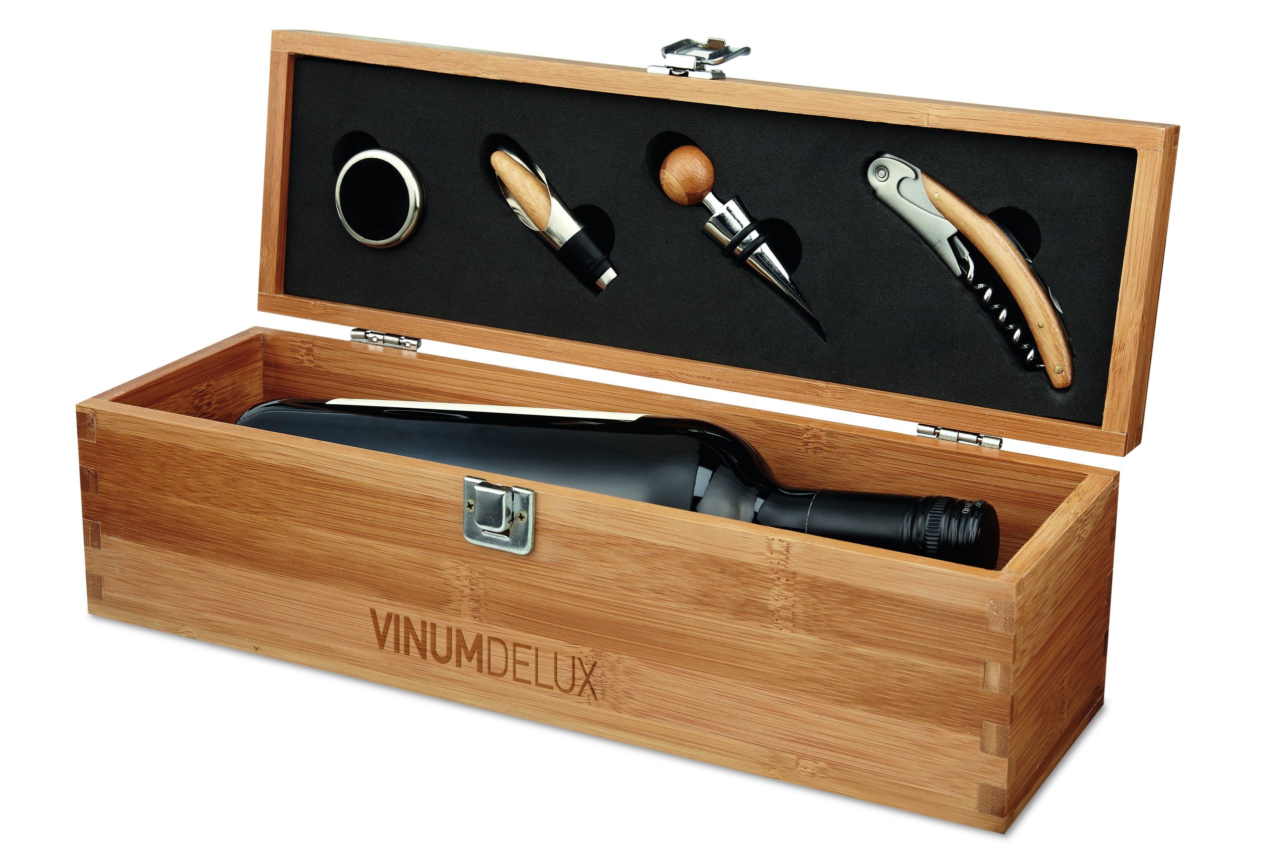 Wine set in bamboo gift box with space for one wine bottle. Includes bottle collar, pourer, stopper, and corkscrew. Wine bottle not included. Bamboo is a natural product, there may be slight variations in colour and size per item, which can affect the final decoration outcome.