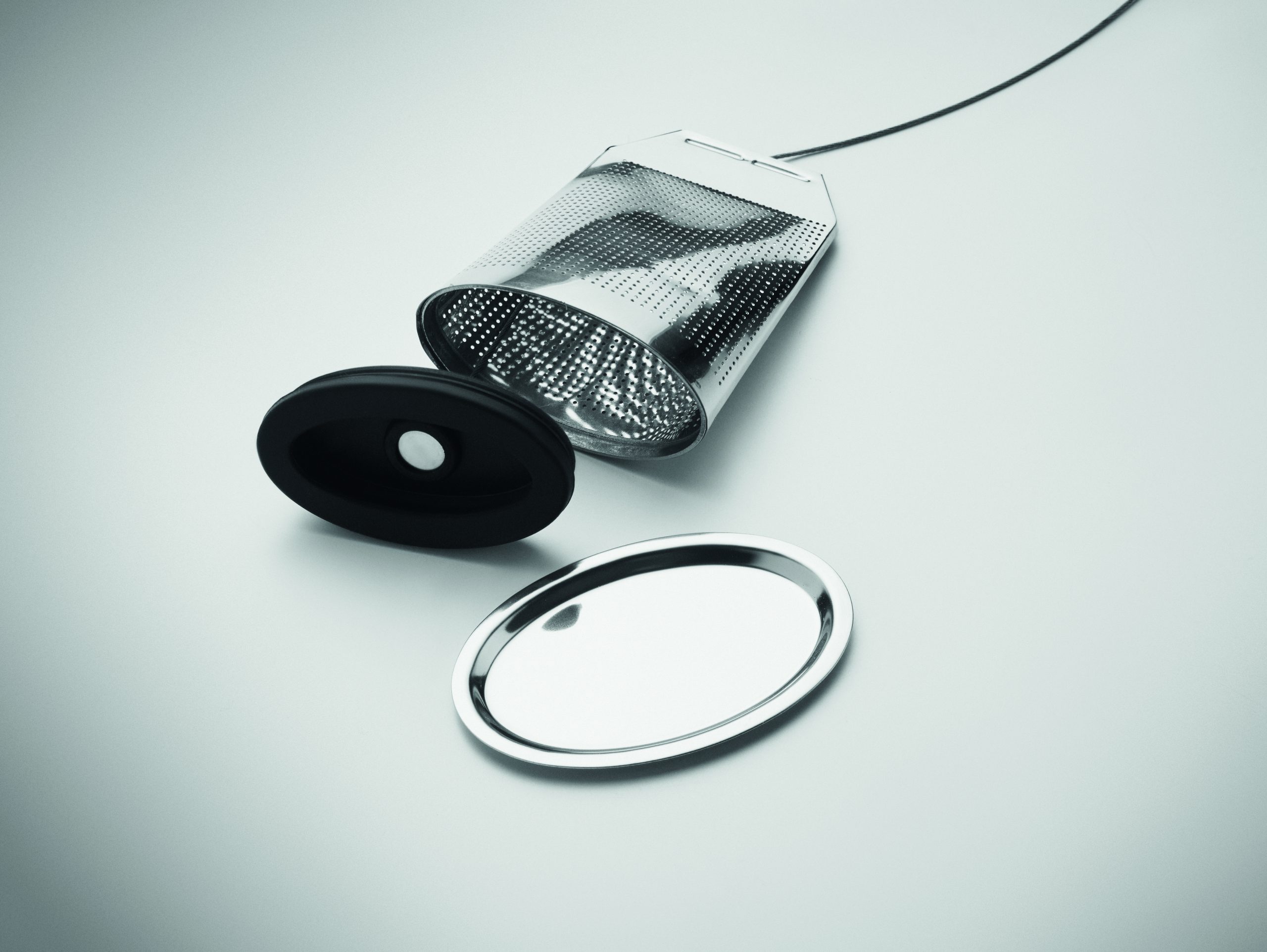Stainless steel tea infuser in teabag shape with plate. Large tea strainer with silicone handle.