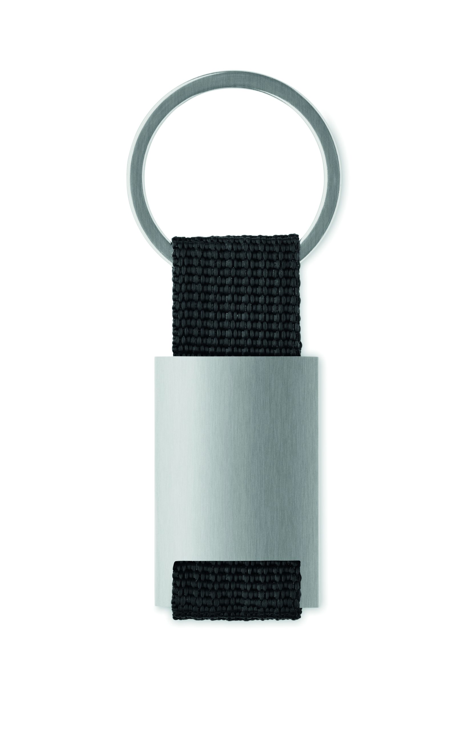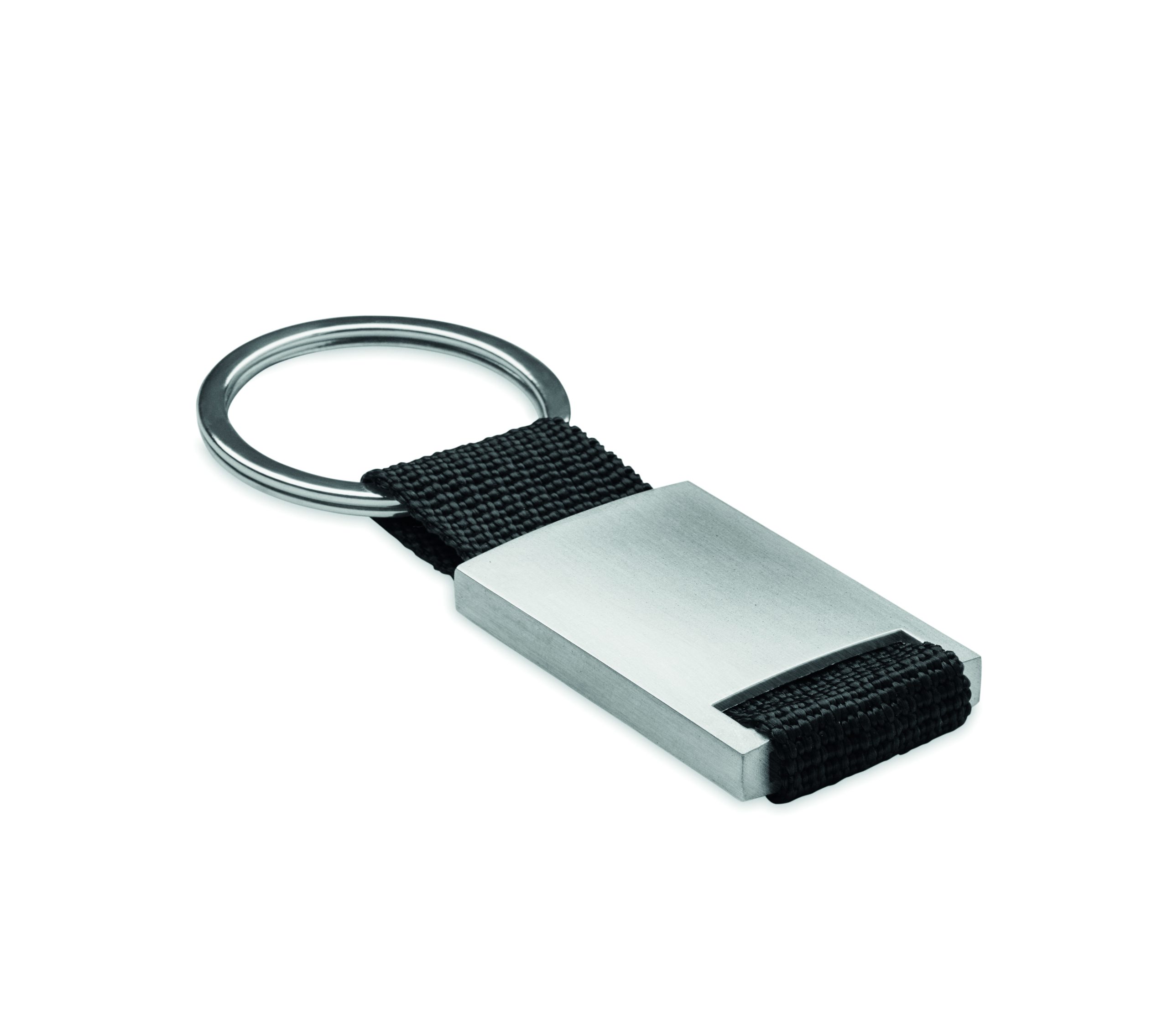Metal rectangular key ring with coloured polyester webbing. Individually packed in a carton gift box.