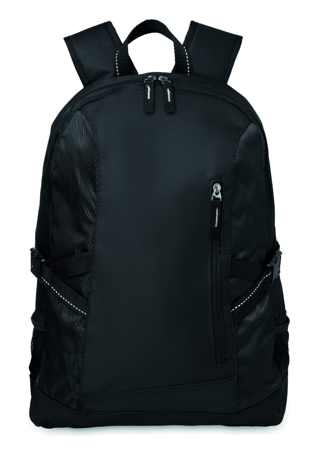 15 laptop backpack in 600D with rip stop details. Includes one internal 15 laptop compartment, one main front zippered pocket and 2 side compartments. Adjustable shoulder strap.