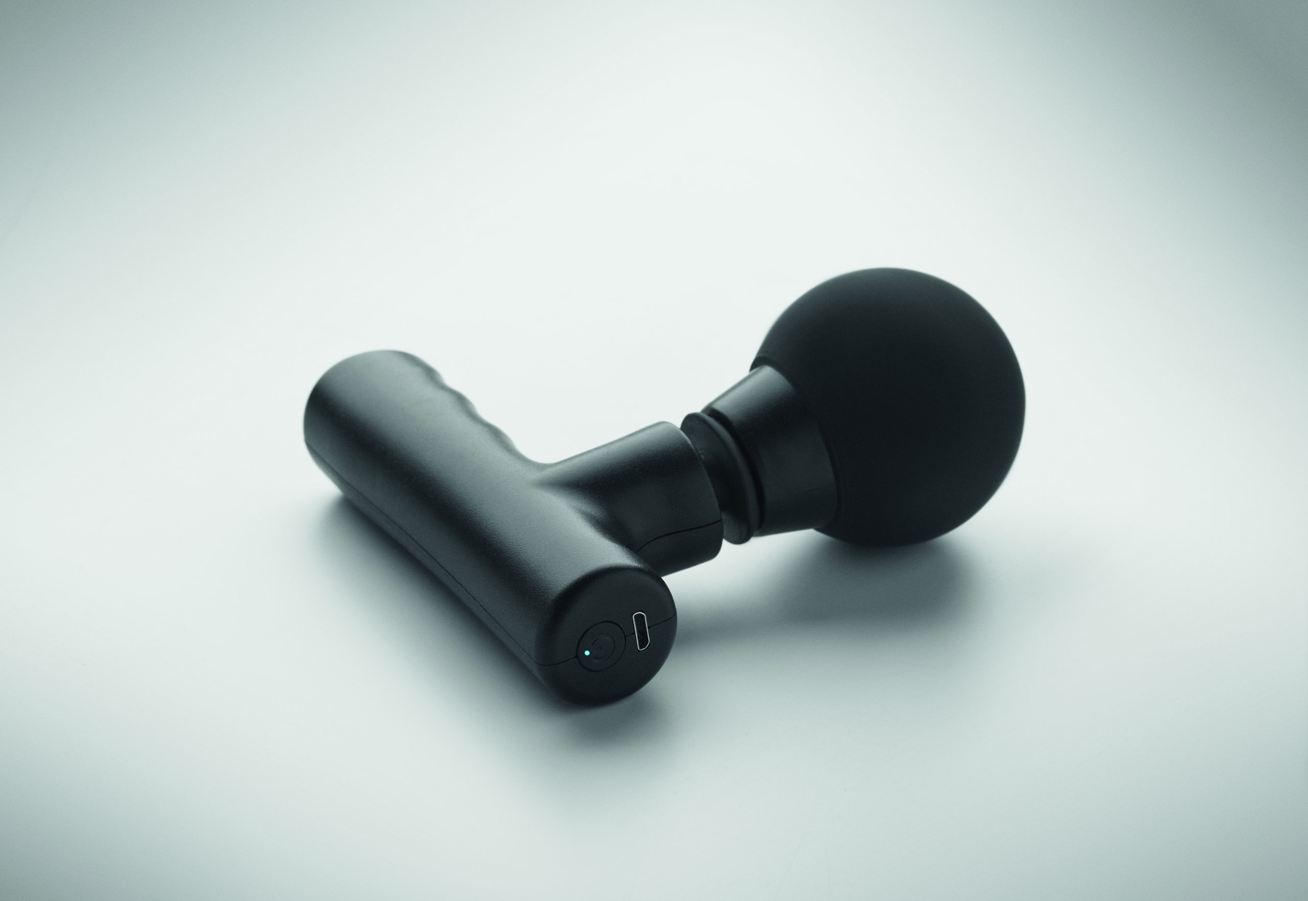 Massage gun with 2 speed level in ABS. Rechargeable 1200mAh battery. Comes with an RPET pouch.