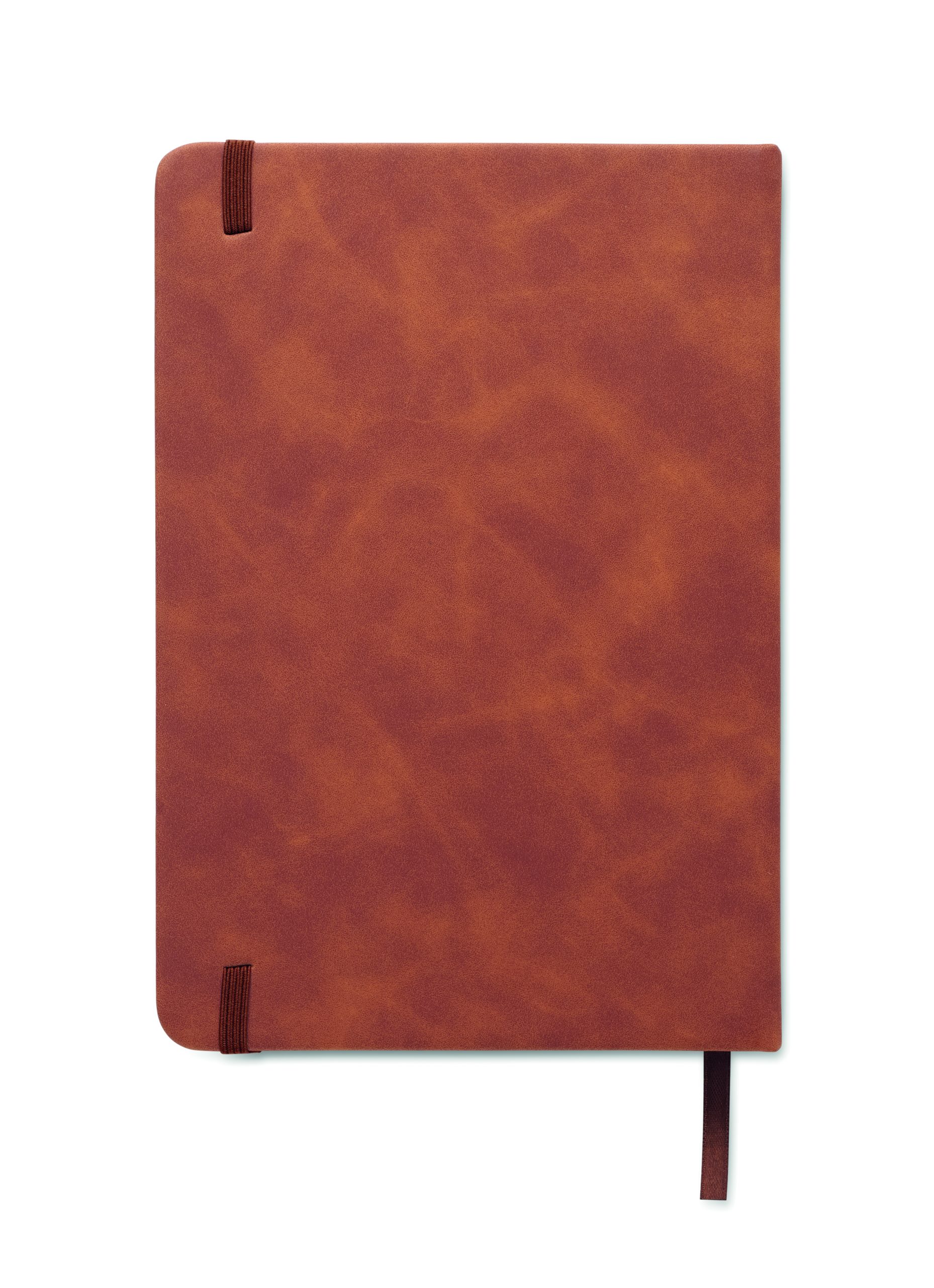 A5 notebook in 40% recycled post consumer smokey hard PU cover and 60% PU cover. Casebound. 160 lined pages, 70gsm recycled paper (80 sheets). Matching elastic closure strap and ribbon page marker.