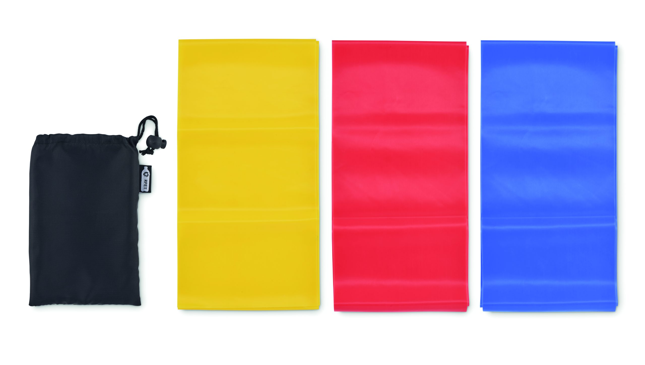 Set of 3 TPE fitness bands in RPET polyester pouch. Fitness bands all have a different strength for optimal training.